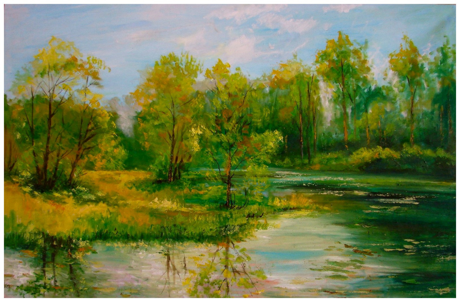Na obrazie widać spokojny zakątek nad wodą. Zieleń dominuje, ale nie jest to jedna zieleń, tylko cała mieszanina od oliwkowej po soczystą, z plamami żółci jak rozlane słońce. Drzewa stoją w lekkim półokręgu. Rzeka ciągnie się po prawej i odbija korony w miękkich smugach. Niebo jest błękitne z różowawymi chmurami, delikatnie rozmyte. Nastrój leniwy i cichy, aż chce się usiąść i nic nie mówić. Technika malarstwo olejne z impresjonistycznym dotykiem, szybkie pociągnięcia pędzla, światło robi tu całą robotę. Czuję tu ukojenie, ale też coś jak tęsknota za latem. Obraz sygnowany, werniksowany, Certyfikat.