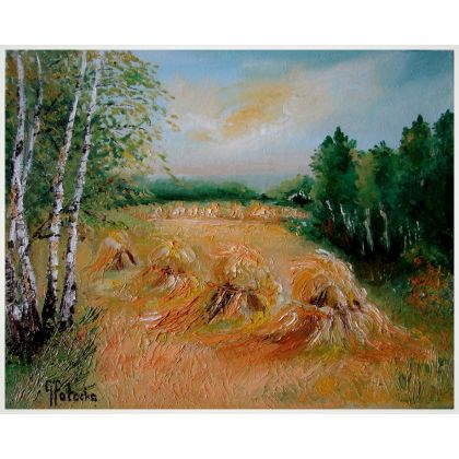 OBRAZ OLEJNY NA PŁÓTNIE POLE SNOPKÓW MALOWANY PĘDZLEM I SZPACHELKĄ, GRUBA FAKTURA FARBY, SYGNOWANY, WERNIKSOWANY, ROZMIAR 24-30CM