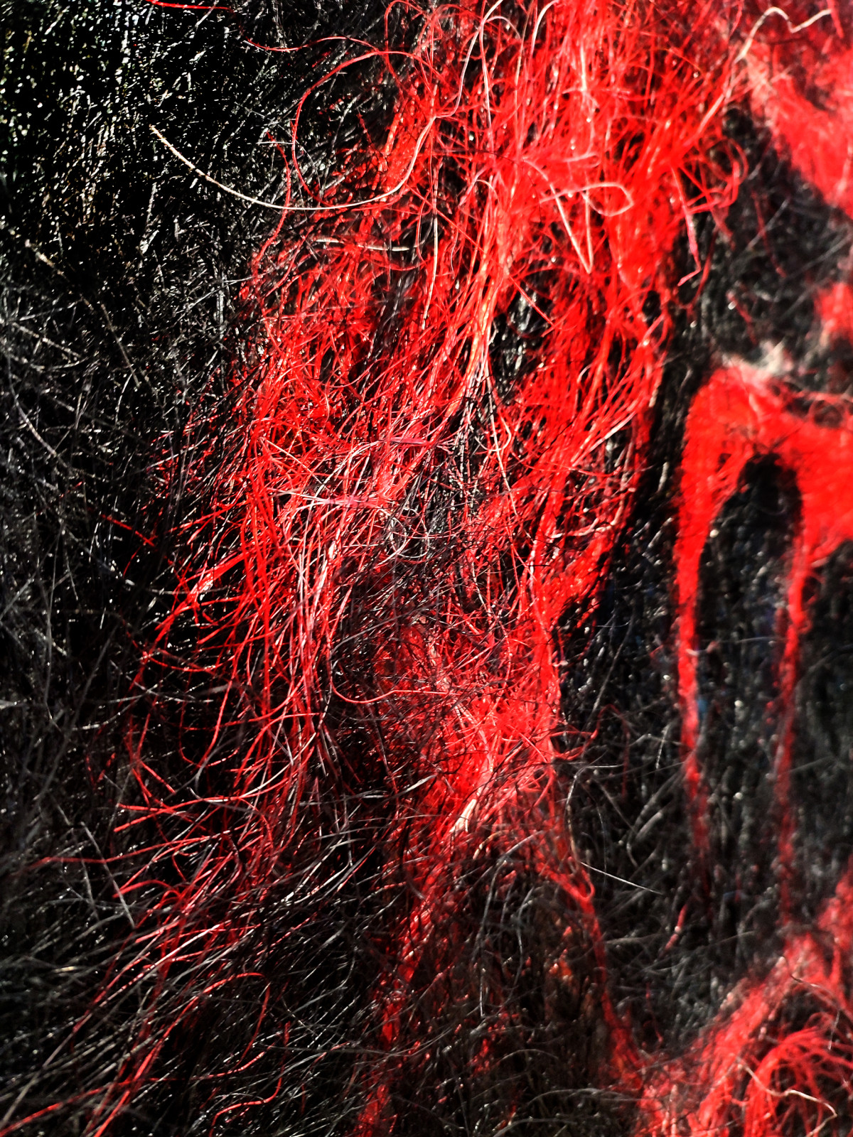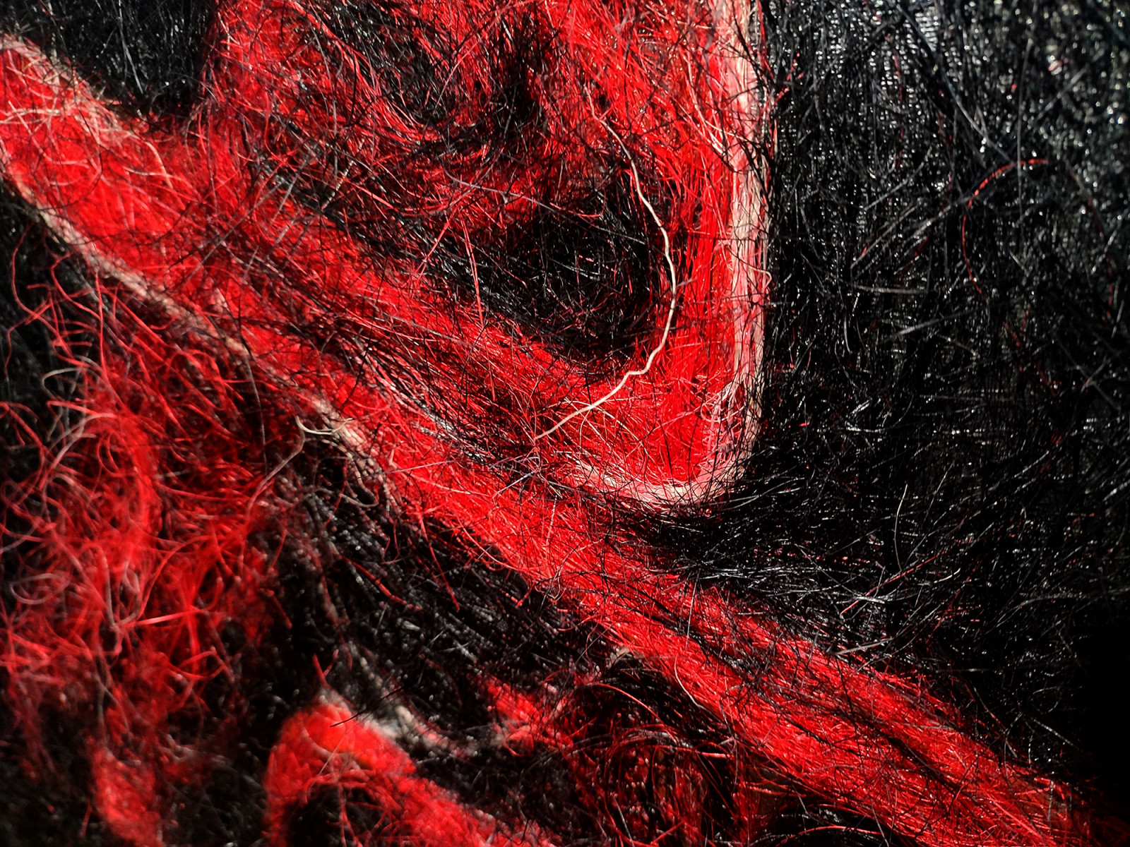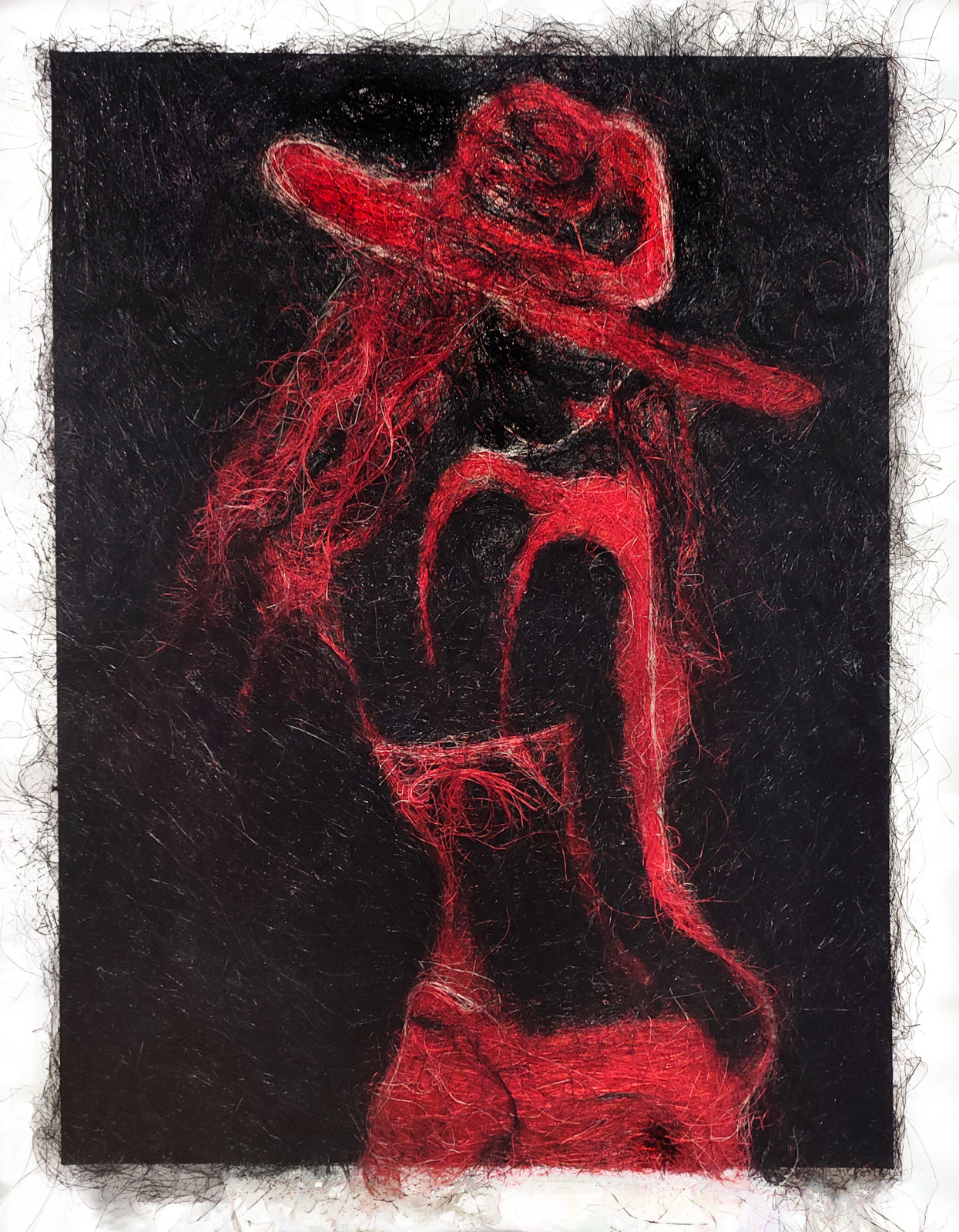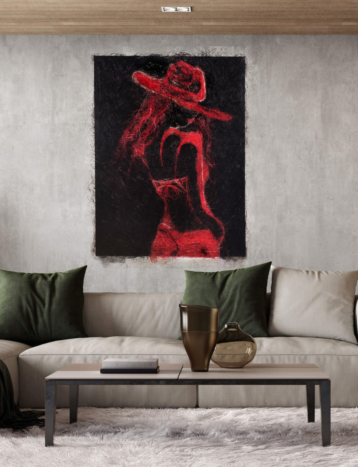 Unikatowy obraz wykonany w technice sizalu naklejonego na płótnie, łącząca malarską ekspresję z trójwymiarową strukturą włókien. Czerwień i czerń tworzą hipnotyczny kontrast, a swobodnie układane pasma sizalu budują wrażenie ruchu i energii. Sylwetka wyłania się z mroku niczym szkic światłem — sugestywna, pełna dynamiki i niedopowiedzeń.