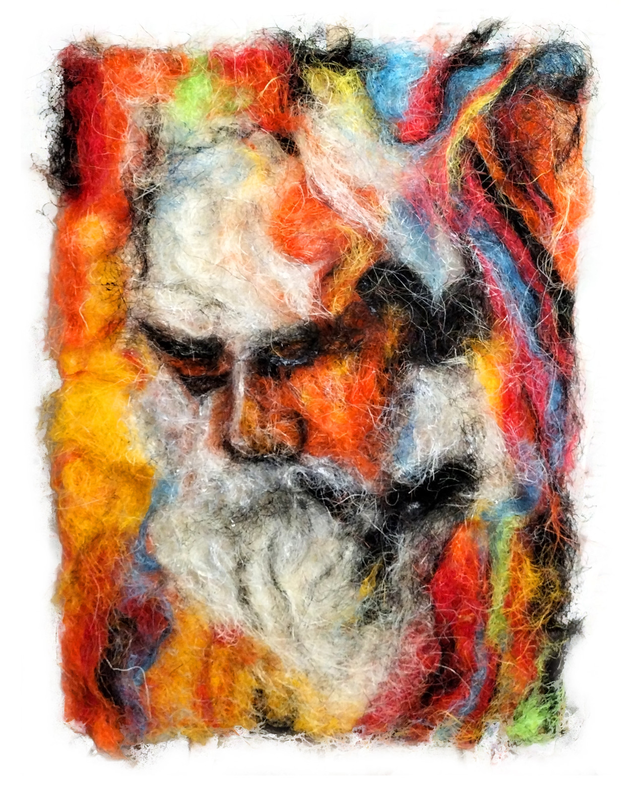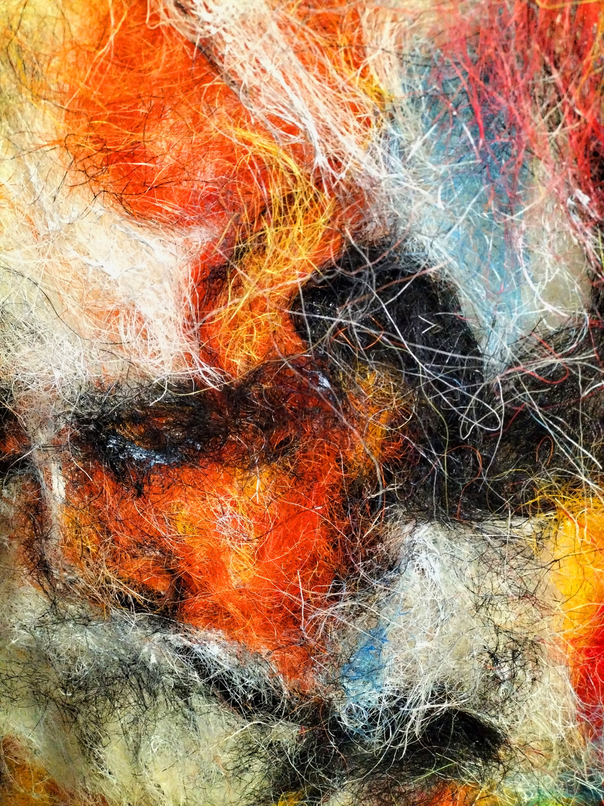 Kolorystyczna ekspresja zestawiona z organiczną strukturą włókien tworzy silne napięcie między delikatnością portretu a materialnością podłoża. Każdy element faktury staje się autonomicznym znakiem, dzięki czemu dzieło funkcjonuje na granicy malarstwa i obiektu.