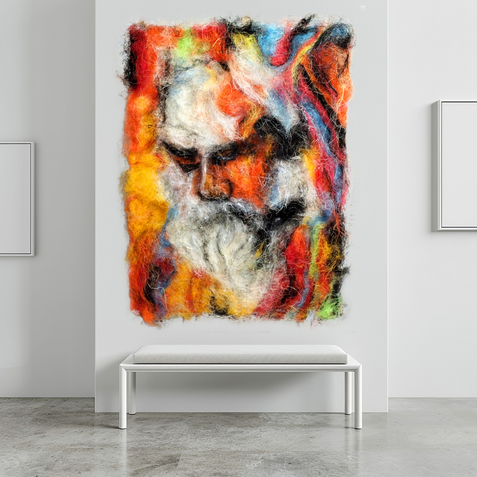 Prezentowana praca stanowi wyjątkowy przykład współczesnej interpretacji portretu, w której artysta łączy klasyczny temat z nieszablonową materią. Twarz mężczyzny – utrzymana w tonacji introspekcji i skupienia – zostaje ujęta w dynamiczne pole barw, tworzące ażurową, niemal energetyczną aurę. Zastosowanie naturalnego sizalu nadaje kompozycji wyraźną, rzeźbiarską fakturę, wzmacniając wrażenie obecności i emocjonalnej głębi.