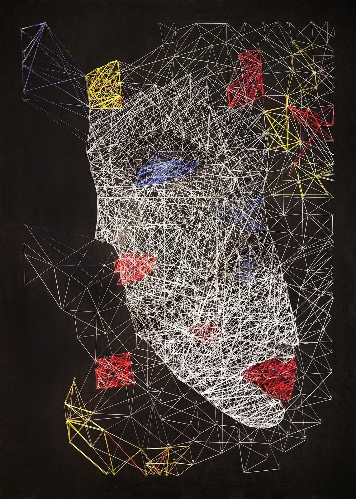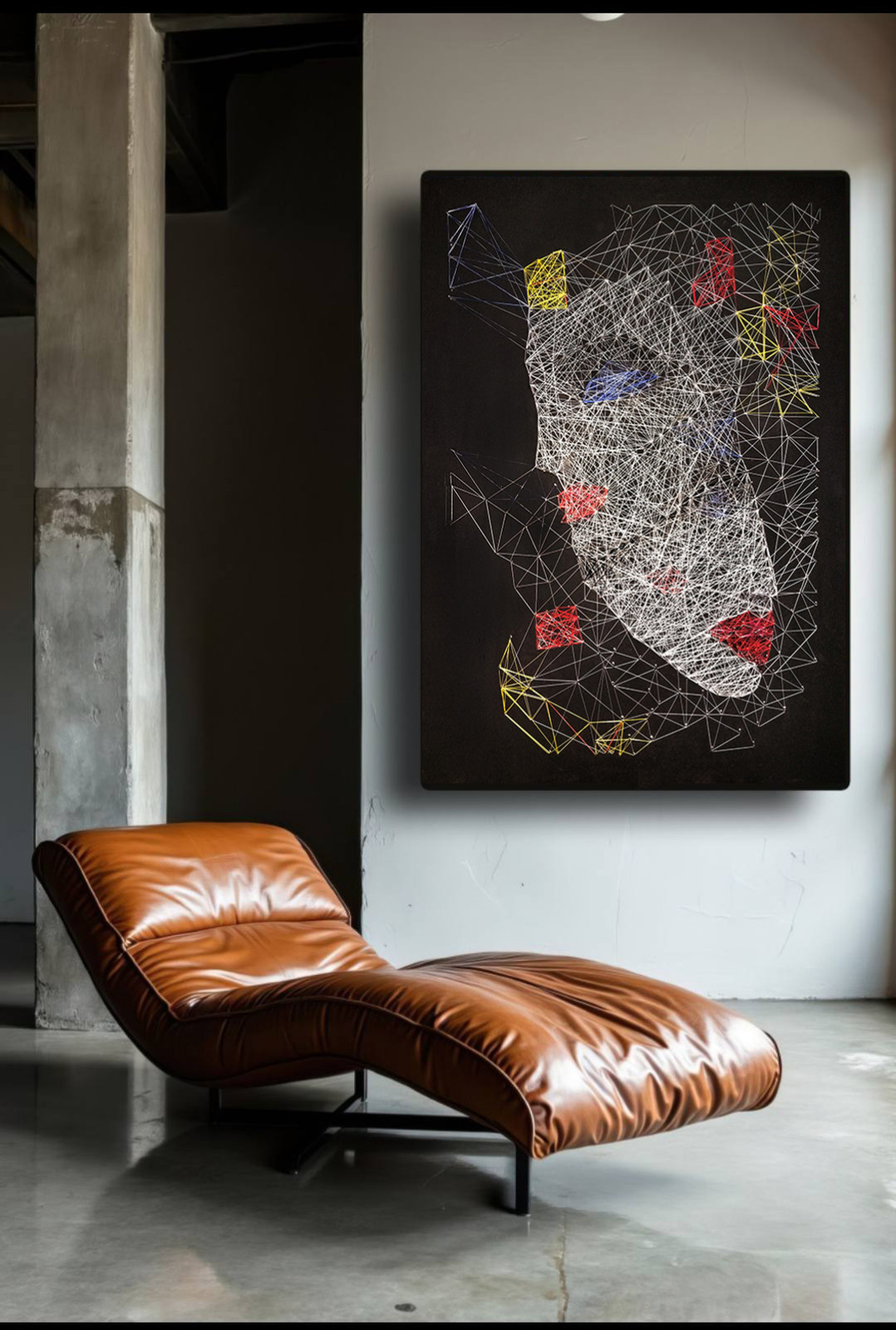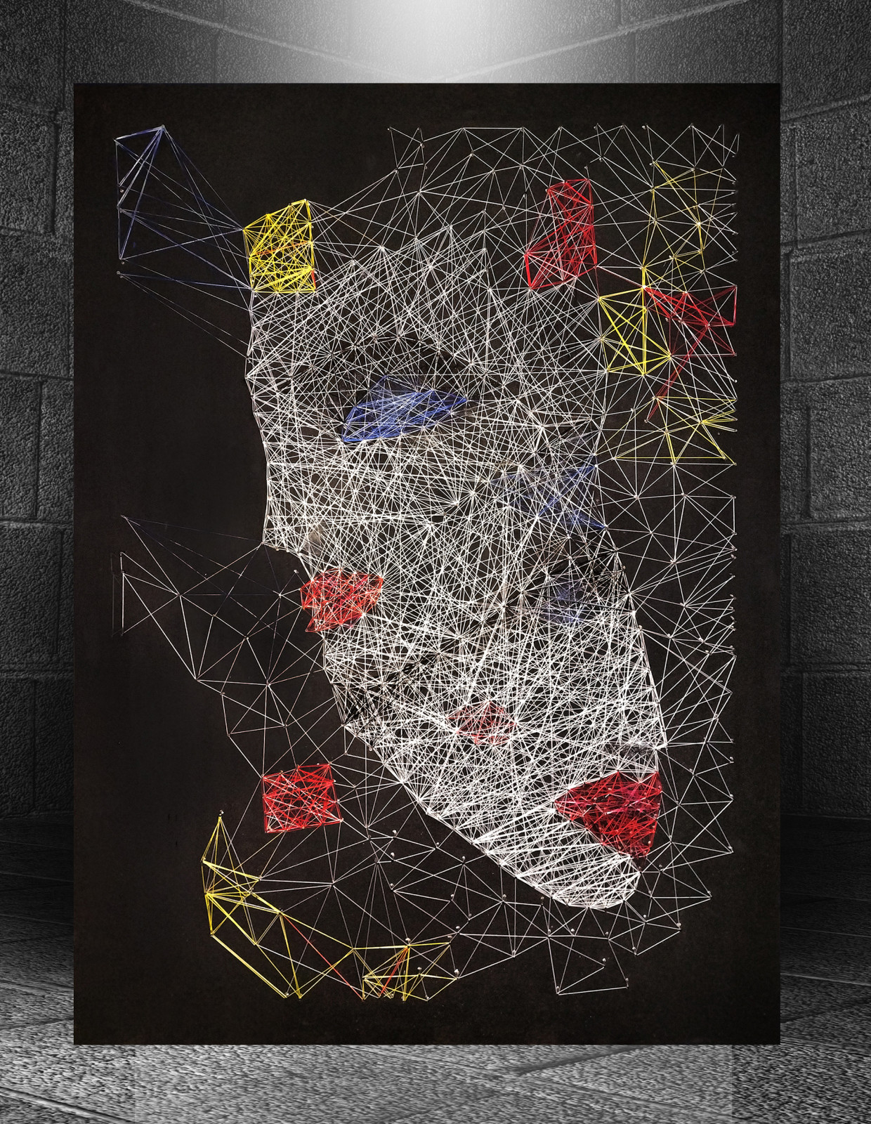 Ręcznie wykonany obraz stworzony w technice string art. Portret zbudowany z setek metrów kolorowych nici napiętych na starannie rozmieszczonych gwoździkach, tworzy wyjątkową, ekspresyjną kompozycję o silnym wyrazie emocjonalnym.
