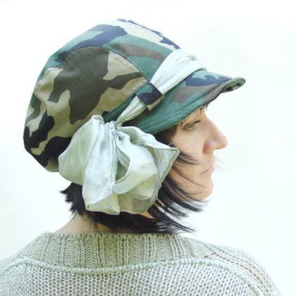 nad daszkiem szlufki, w które można wciągnąć cienką apaszkę (pokazane na zdjęciu nr 3), paseczek lub sznurek