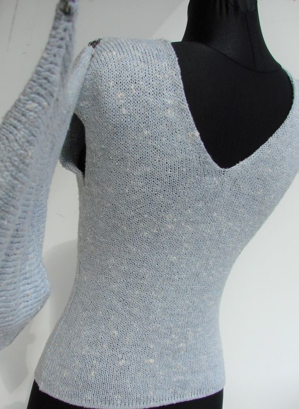 mała bluzeczka z pięknej bawełnianej włóczki w stonowanym niebieskim kolorze, z lekkimi nopami ecru