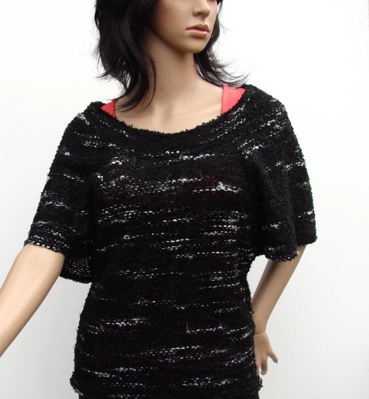 coś na wierzch, na golf, na bluzkę, na top, z czarno-białej melanżowej, guzełkowatej dzianiny, z dość dużym dekoltem i małym raglanowym rękawkiem, super wykończenie stylizacji zarówno sportowej jak i koktajlowej