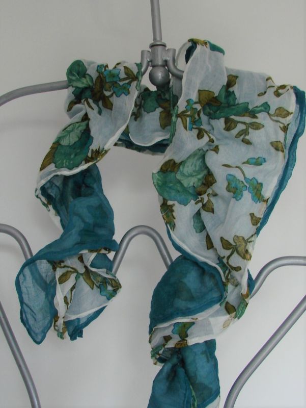 jeden z szaliczków jest gładki, w kolorze turkusowym, natomiast drugi jest w podobnej tonacji i ma wzór kwiatowy.
