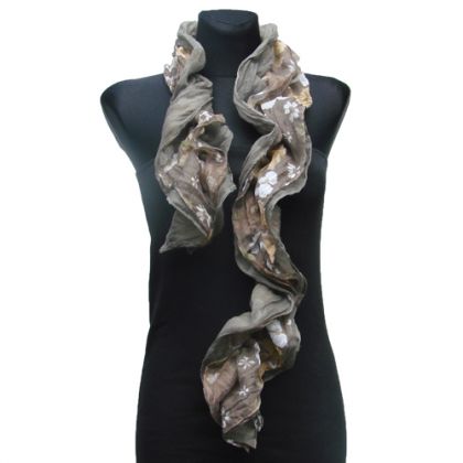 jeden z szaliczków jest gładki, w kolorze kawy z mlekiem, natomiast drugi jest w podobnej tonacji i ma wzór kwiatowy.