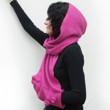 Można go również nosić jako szal ze zwisającym na plecach kapturem.