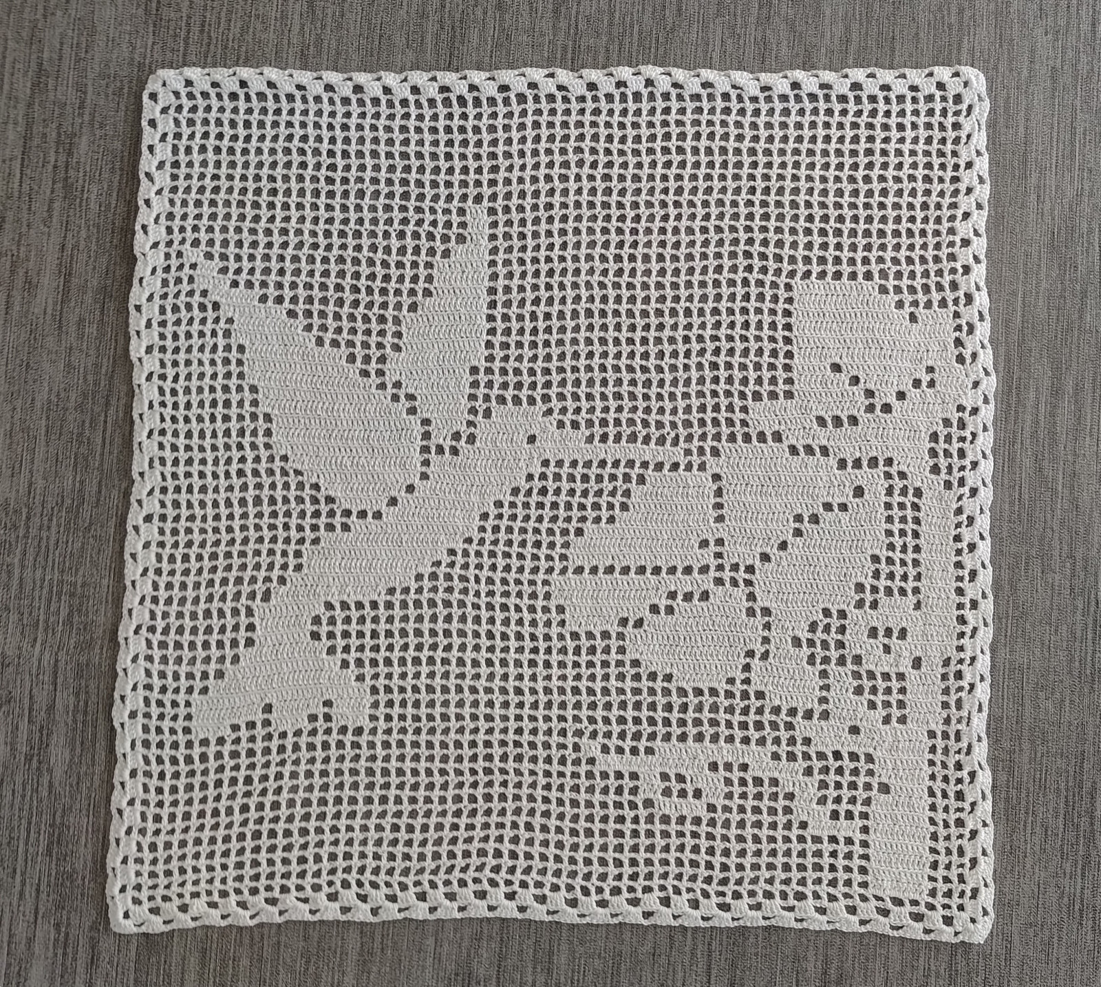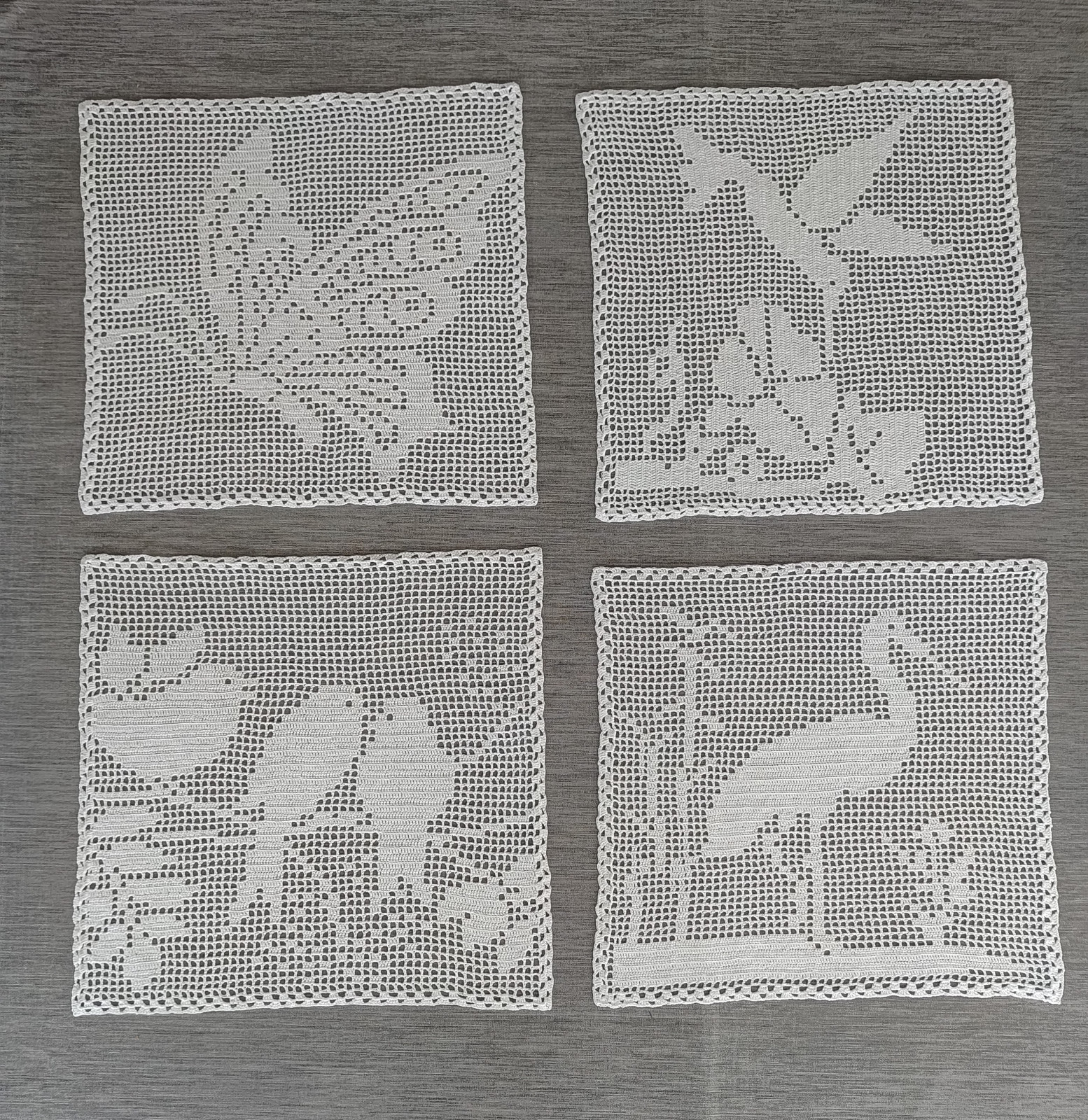 4 serwetki robione ręcznie na szydełku 40 x 40 cm każda. Temat ptaszki. Jeśli potrzeba byłoby więcej serwetek z ptaszkami to mogę wysłac zdjęcia, mam jeszcze kilka zrobionych. Pojedyncze w cenie 65zł za szt.