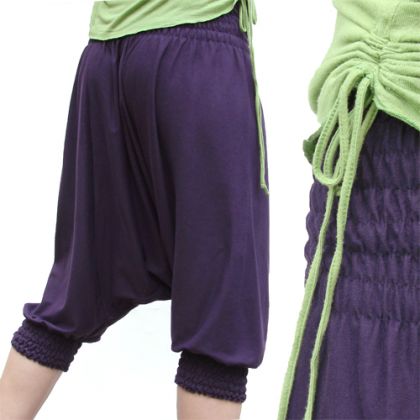 w pasie i zakończeniu nogawek liczne przeszycia z gumek, powodujące dużą tolerancję rozmiarową