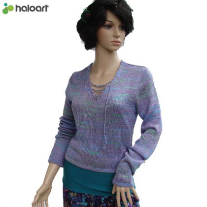 sznurek wpleciony w dekolt nadaje sweterkowi oryginalnego charakteru