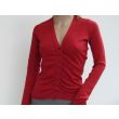 Uniwersalny kobiecy sweterek z marszczeniami, zapinany na małe guziki, w malinowym kolorze. Doskonale komponuje się ze spódniczką na szelkach, zrobioną z tej samej, bardzo miłej w dotyku, lekkiej dzianiny