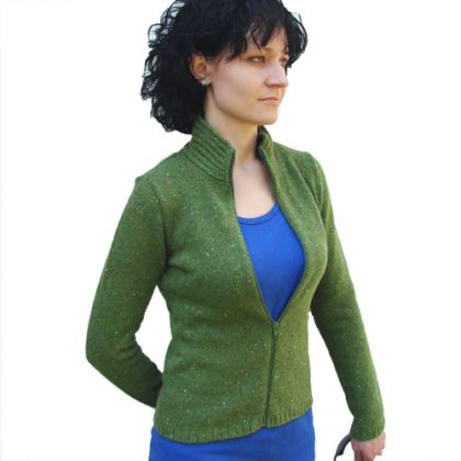 z wełnianej, zielonej dzianiny, z delikatnymi, różnokolorowymi nopami