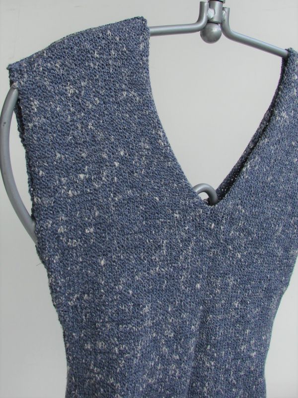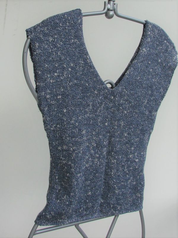 Mała bluzeczka, topik, z bawełnianej włóczki w kolorze dżinsu, z bawełnianej przędzy.