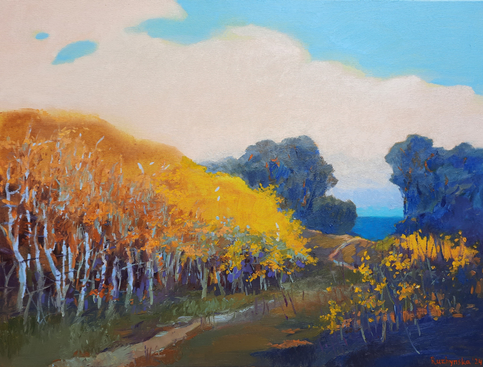 Pejzaż z motywem jesiennej ścieżki prowadzącej przez piaszczyste wydmy w kierunku morza. Obraz oparty jest na kontraście ciepłych piaskowych tonów i chłodnych błękitów, z wyraźną fakturą farby olejnej i dynamicznym, malarskim światłem.