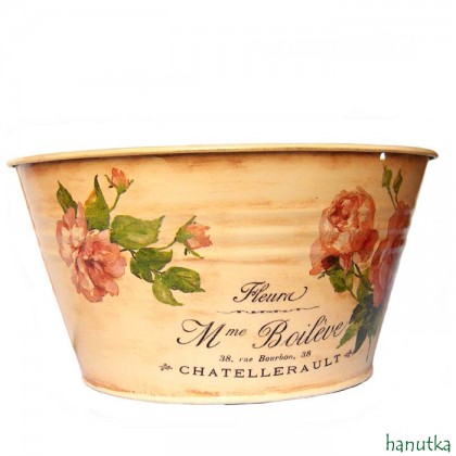 Duża, elegancka, metalowa osłonka na doniczkę ozdobiona techniką decoupage, lekko patynowana. Zabezpieczona wieloma warstwami ekologicznego lakieru akrylowego z lekkim połyskiem.