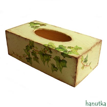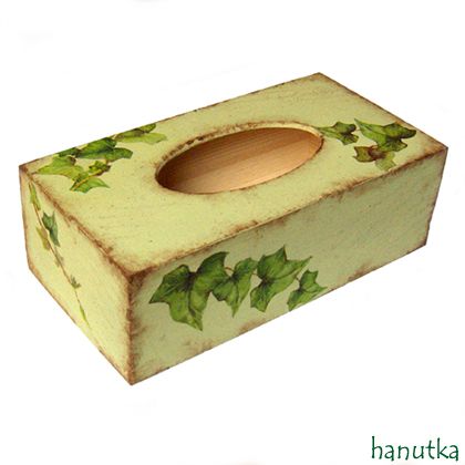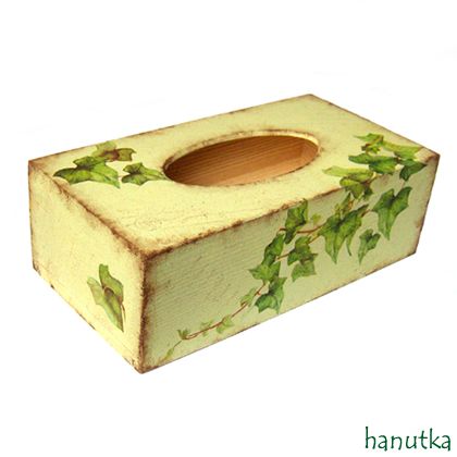 Stylowe, nieco rustykalne drewniane pudełko na chusteczki. Malowane na seledynowo farbami akrylowymi, ozdobione techniką decoupage oraz stencil na wszystkich ściankach, postarzane patyną. Wielokrotnie pokryte specjalnym lakierem akrylowym bardzo matowym, bezwonnym, nietoksycznym, dającym powierzchnię imitującą w dotyku zamsz.