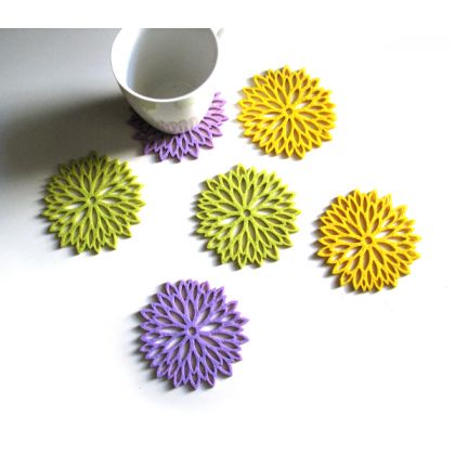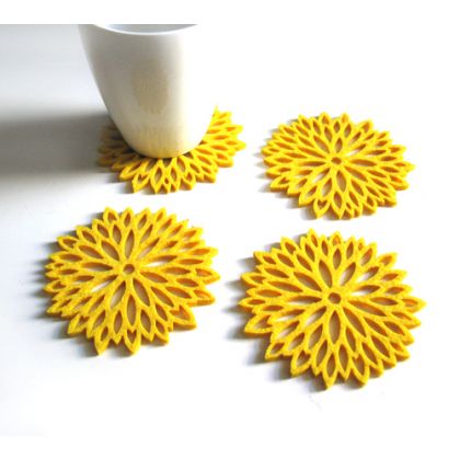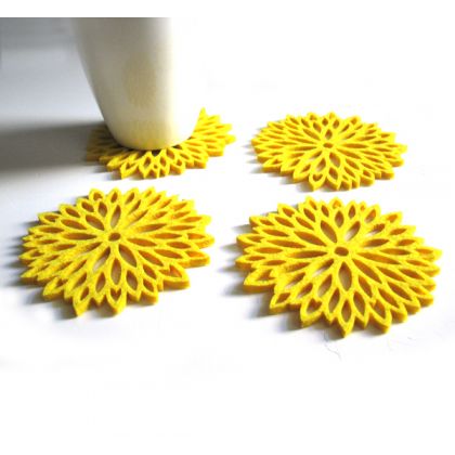 Zestaw czterech ślicznych podkładek pod kubki, wyciętych laserowo w filcu grubości 4mm, w słonecznym, żółtym kolorze. Urocze, lekkie, delikatne. Pięknie wyglądają na stole, mogą stanowić zestaw z dostępną w galerii serwetką o tym samym kształcie. Idealnie nadają się na prezent. polecam