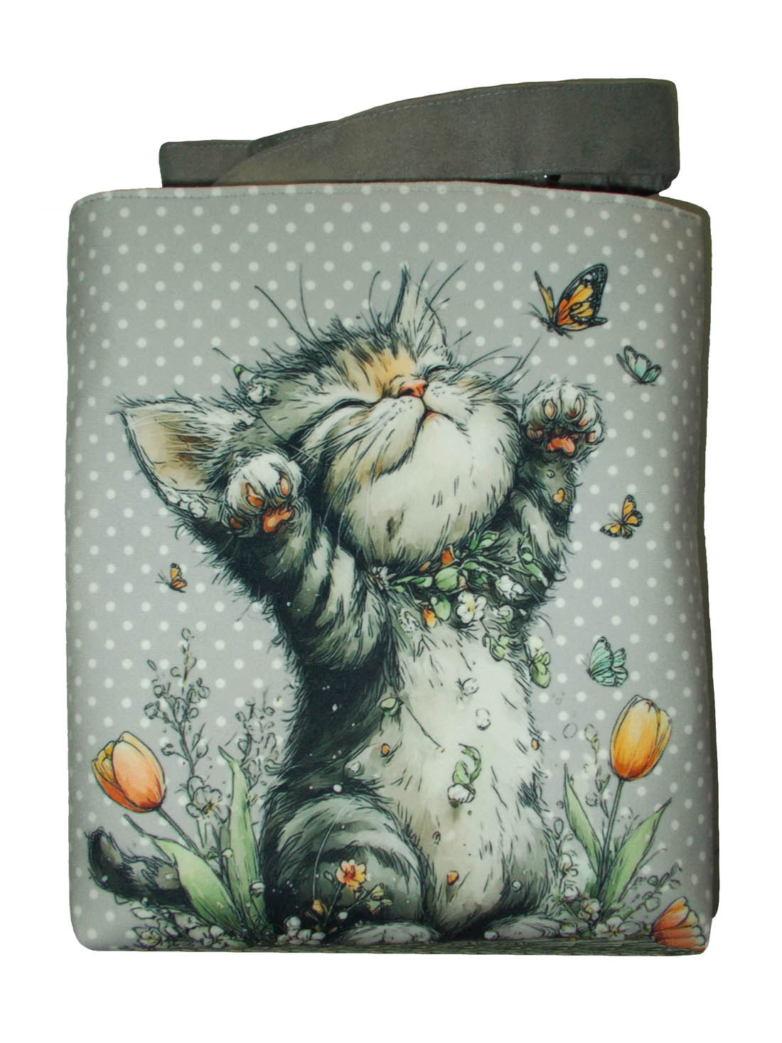 Autorska torba z usztywnionego eko zamszu, zapinana na zamek. Przód z weluru tapicerskiego. Pasek regulowany. Tył w korze paska (szary) Torba trzyma fason. Wewnątrz dwie kieszenie - jedna na zamek, druga z miejscem na telefon i coś jeszcze. W szwach wypustka. Denko poszerzone. szerokość 32cm wysokość 30cm plus denko 8cm