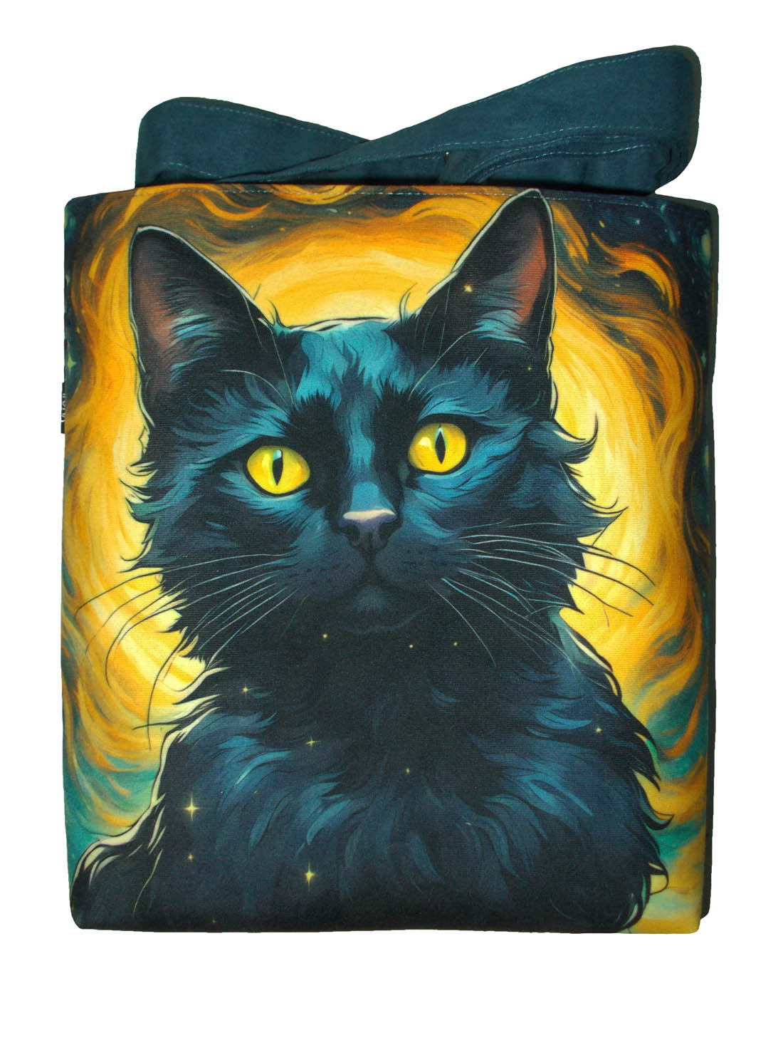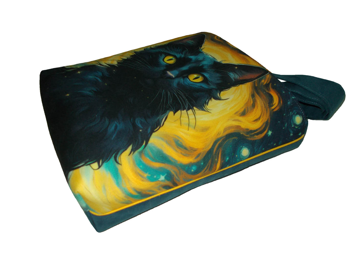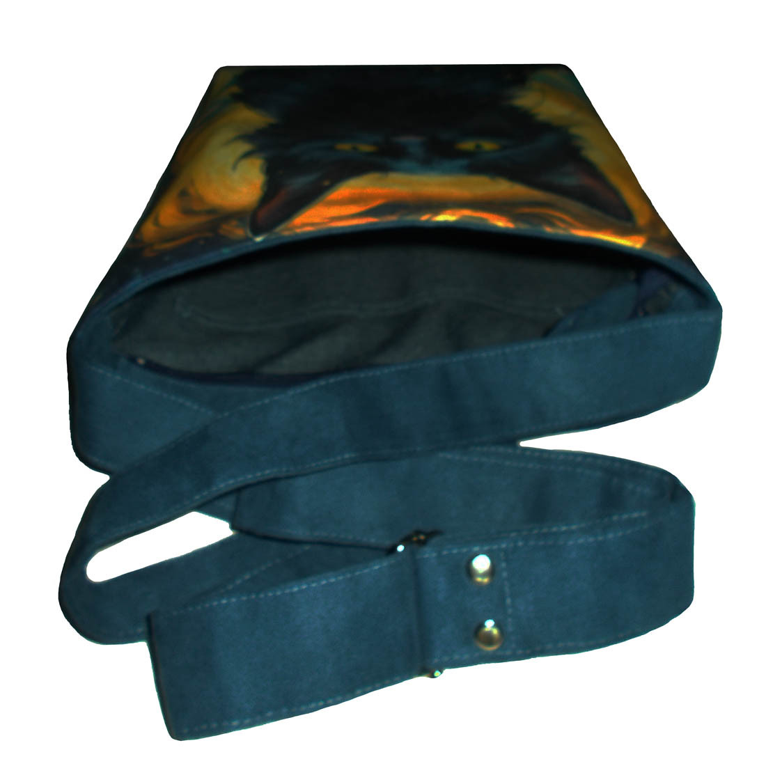 Autorska torba z usztywnionego eko zamszu, zapinana na zamek. Przód z weluru tapicerskiego. Pasek regulowany. Tył w kolorze paska (niebieski) Torba trzyma fason. Wewnątrz dwie kieszenie - jedna na zamek, druga z miejscem na telefon i coś jeszcze. W szwach wypustka. Denko poszerzone. szerokość 32cm wysokość 30cm plus denko 8cm