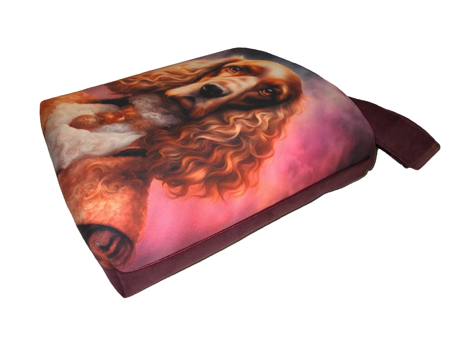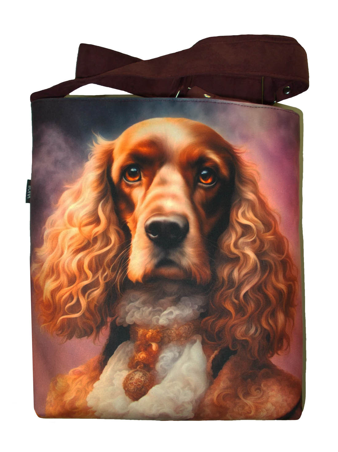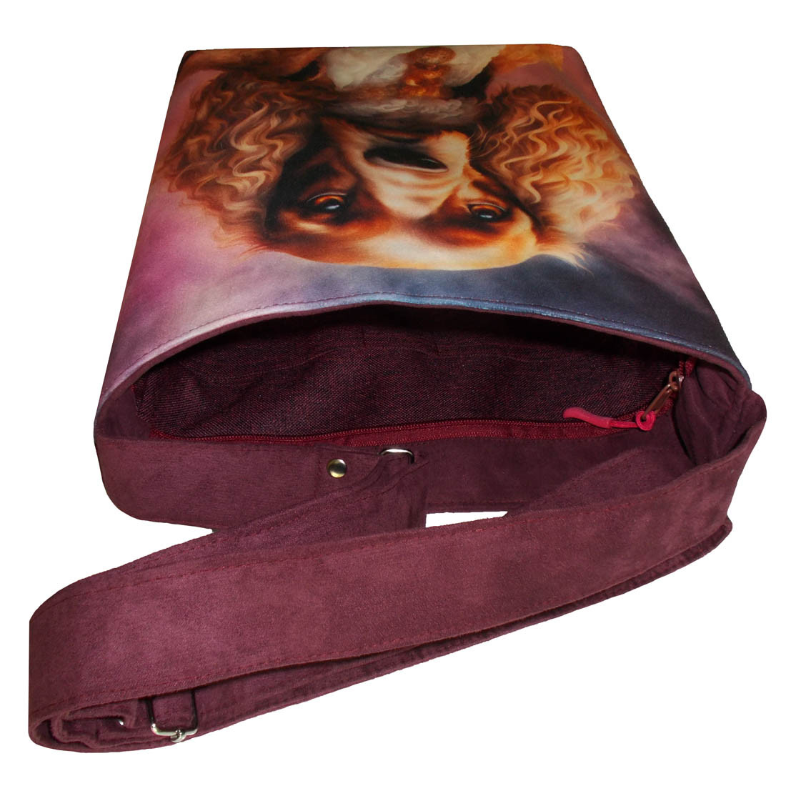 Autorska torba z usztywnionego eko zamszu, zapinana na zamek. Przód z weluru tapicerskiego. Pasek regulowany. Tył w korze paska (bordowy) Torba trzyma fason. Wewnątrz dwie kieszenie - jedna na zamek, druga z miejscem na telefon i coś jeszcze. W szwach wypustka. Denko poszerzone. szerokość 32cm wysokość 30cm plus denko 8cm