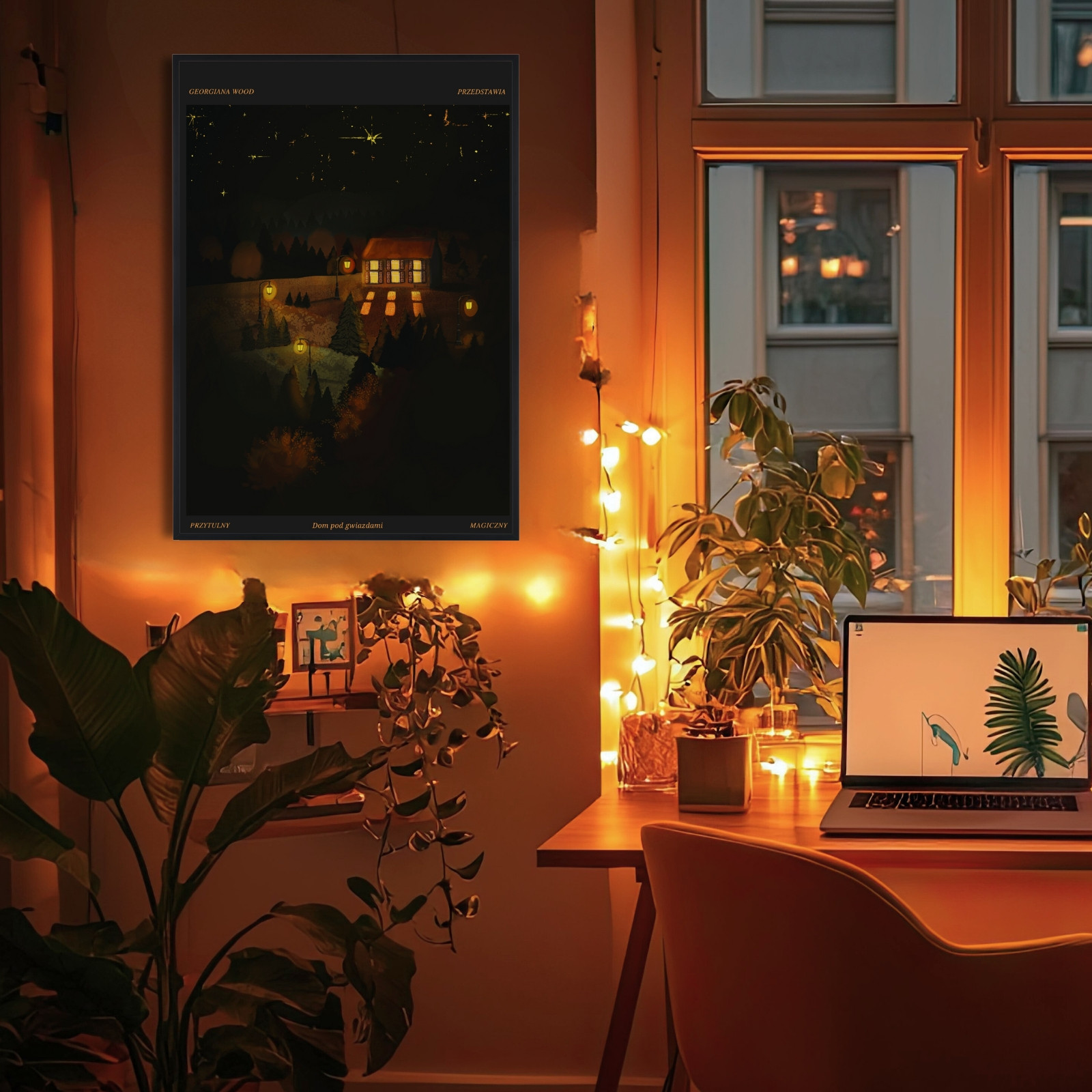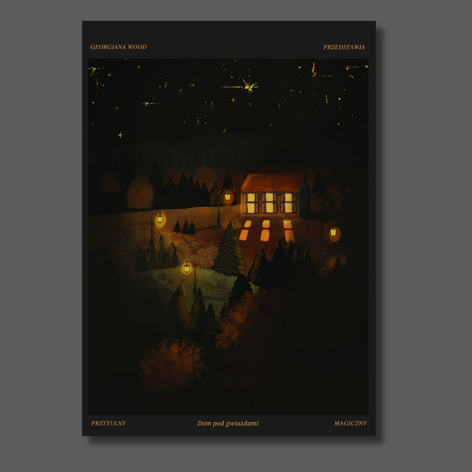 Dom pod Gwiazdami to plakat, który powstał z potrzeby uchwycenia tej jednej chwili spokoju kiedy za oknem ciemność, a w środku domu świeci ciepłe światło. To ilustracja o bezpieczeństwie, ciszy i magii zwykłego wieczoru, kiedy świat zwalnia, a my zatrzymujemy się choć na moment.