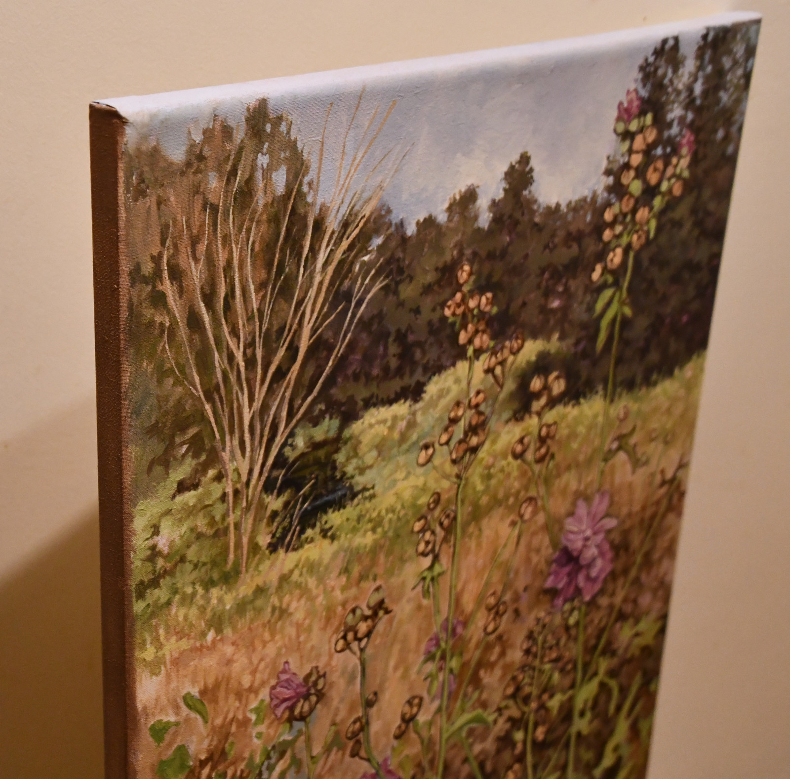 Pejzaż z okolic Radawy, z ujmującym krzewem ślazu na pierwszym planie. Namalowany na płótnie o formacie 45/60. Sygnowany, pokryty werniksem, boki zamalowane w tonacji obrazu. Gotowy do zawieszenia na ścianie.