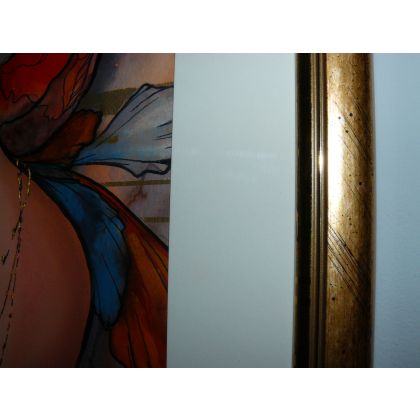 Obraz oprawiony w białe passepartout oraz złota ramę .