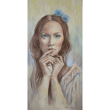 Obraz w pastelowej kolorystyce, przedstawiający romantyczny zamyślony portret pięknej tajemniczej kobiety, skrywającej sekret. Jaka to tajemnica...sami musicie się domyśleć....