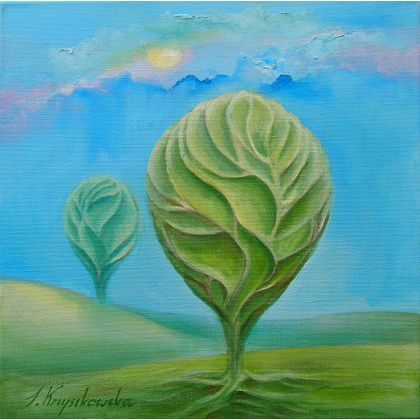 Obraz olejny przedstawiający magiczny krajobraz mojej wyobraźni. Namalowany z pasją i fantazją, starannie wykonany, nawiązujący do nurtu realizmu magicznego. Na pewno doda każdemu wnętrzu niepowtarzalnej atmosfery. Serdecznie polecam.
