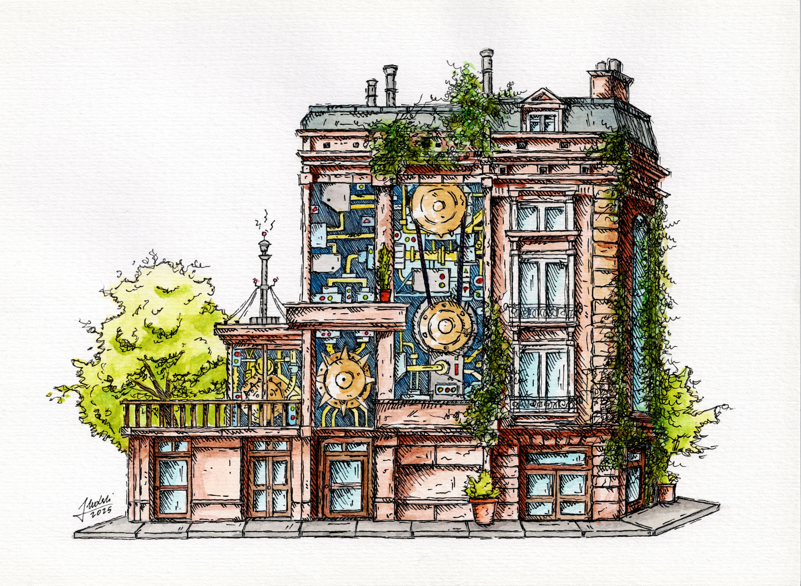 Rysunek w technice tuszu i akwareli na białym papierze 190g.