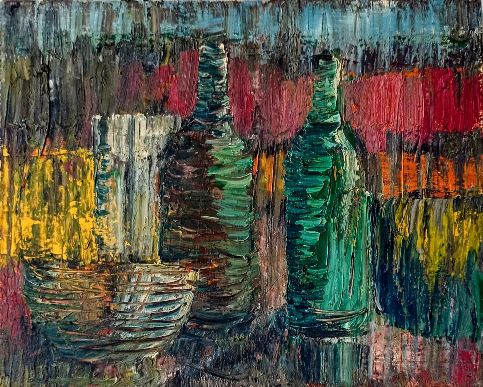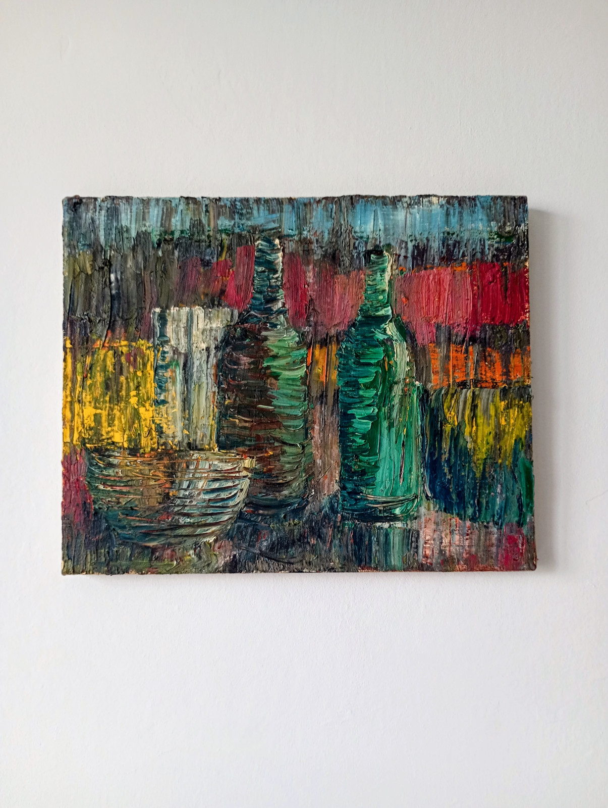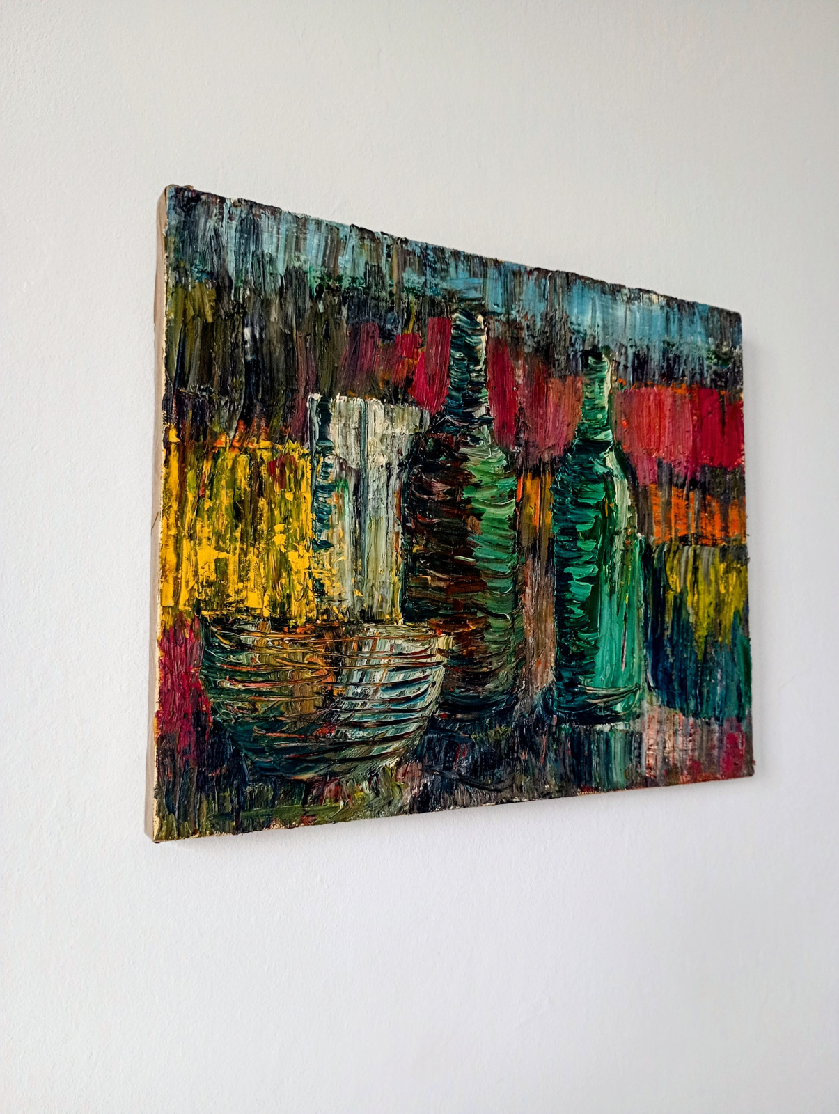 Obraz olejny na płótnie o wymiarach 41x33 cm przedstawiający martwą naturę z butelkami.