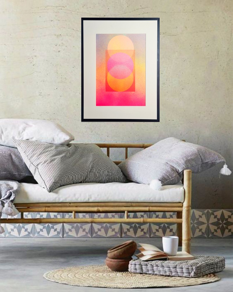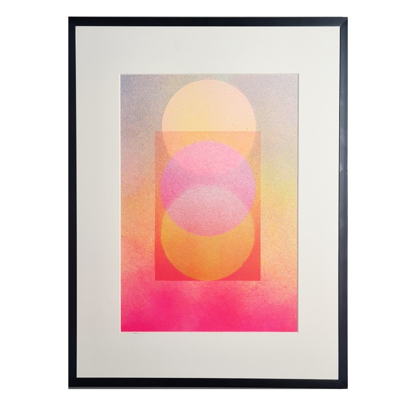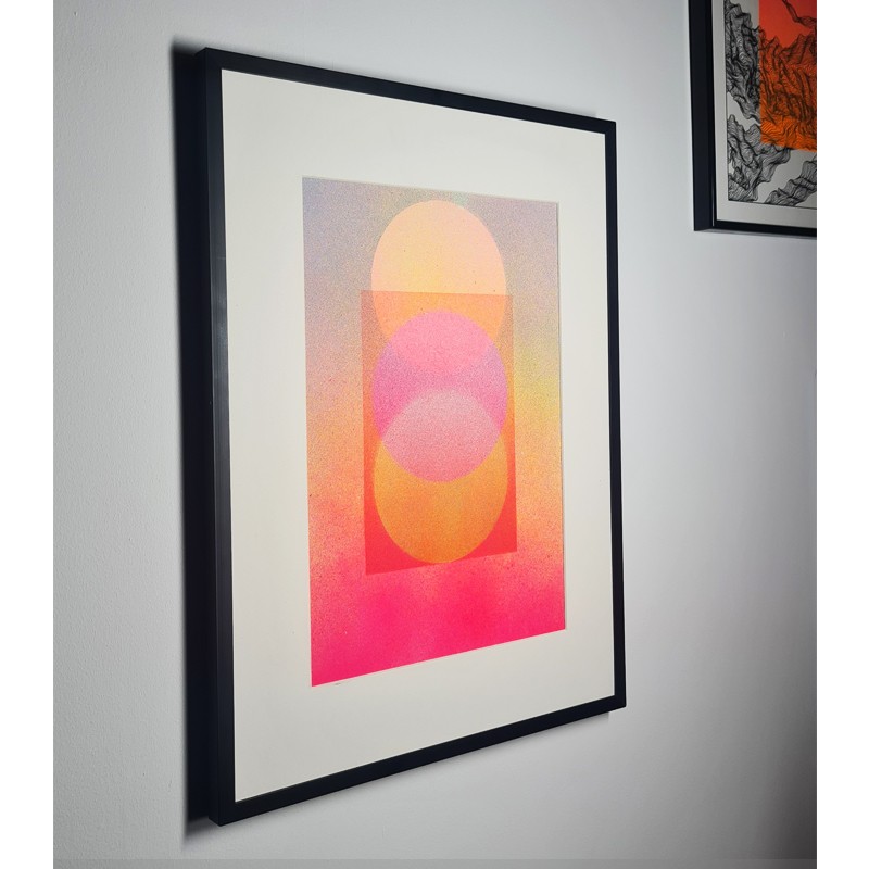 oprawiony jest w metalową ramę o wymiarach 30x40cm z passe-partout.