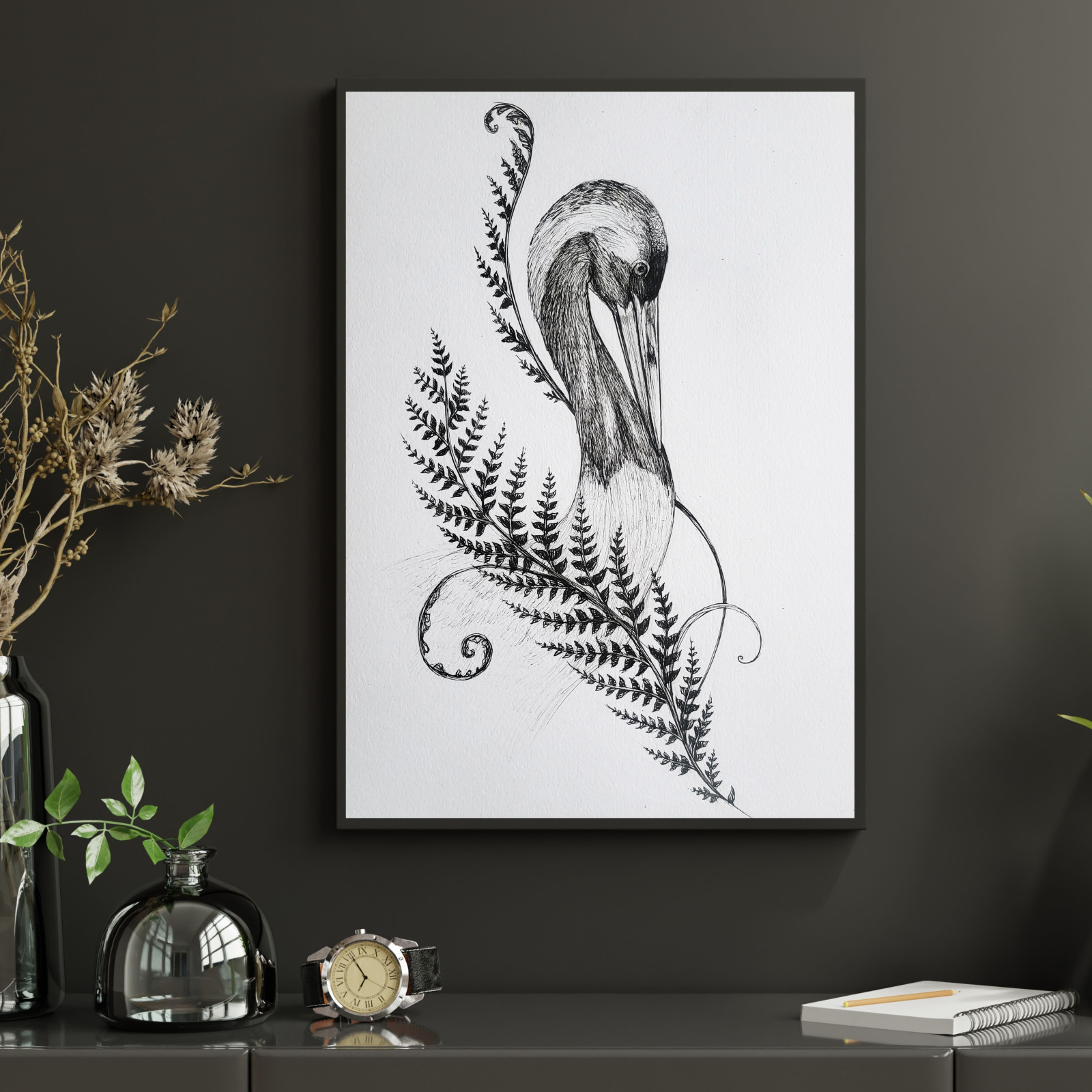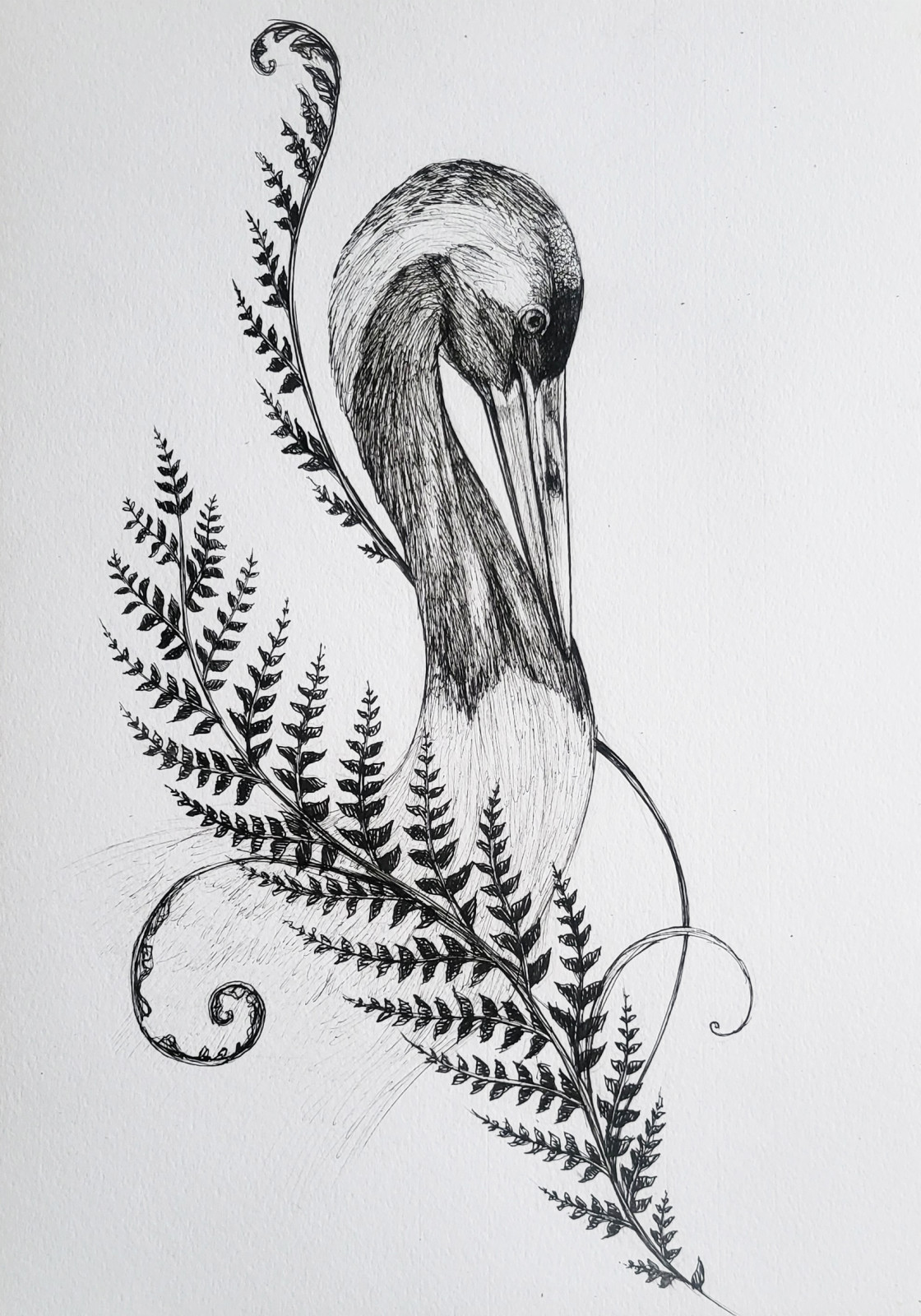 Rysunek tuszem przedstawiający żurawia w paprociach,