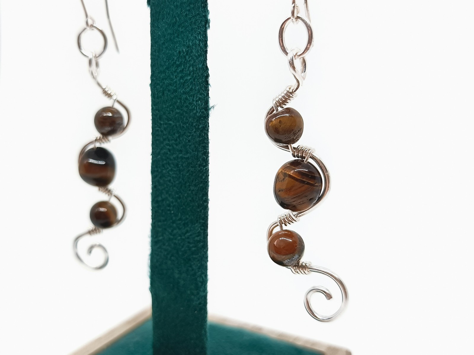 Są to kolczyki wykonane metodą wire wrapping. Do ich stworzenia użyłam miedzianego, posrebrzanego drutu jubilerskiego oraz kamieni - tygrysiego oka. Całość zawieszona jest na srebrnych biglach. Wymiary kolczyków to - 6,5 x 1-1,5 cm.