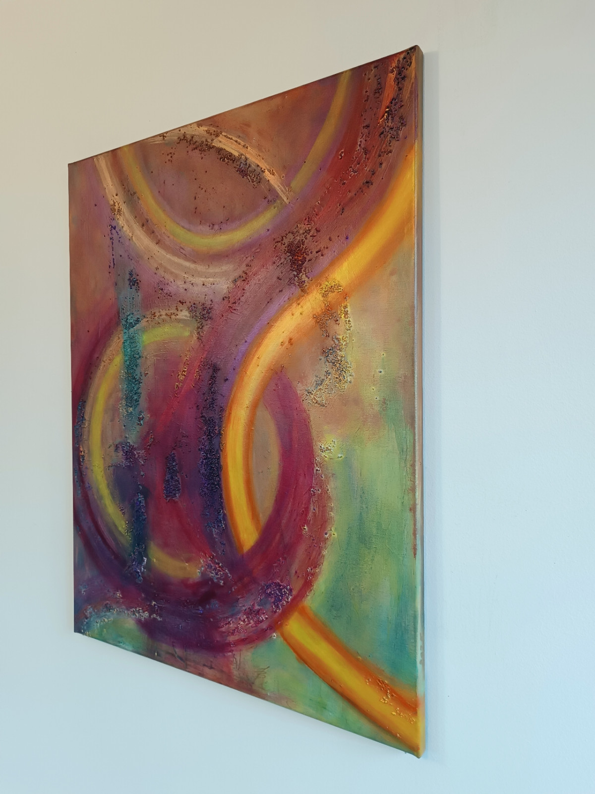 Obraz malowany pastami strukturalnymi i farbami akrylowymi, pięknie odbija światło dzięki metalicznym kolorom. W zależności od kąta jego padania, będzie przybierał mniej lub bardziej intensywne odcienie. Ożywi każde, nawet ciemne wnętrze.