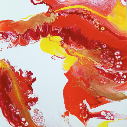 Zastosowałam technikę pouringu, czyli operowania farbami w stanie ciekłym, dodatkowo dodając pięknie napigmentowanych tuszy akrylowych.