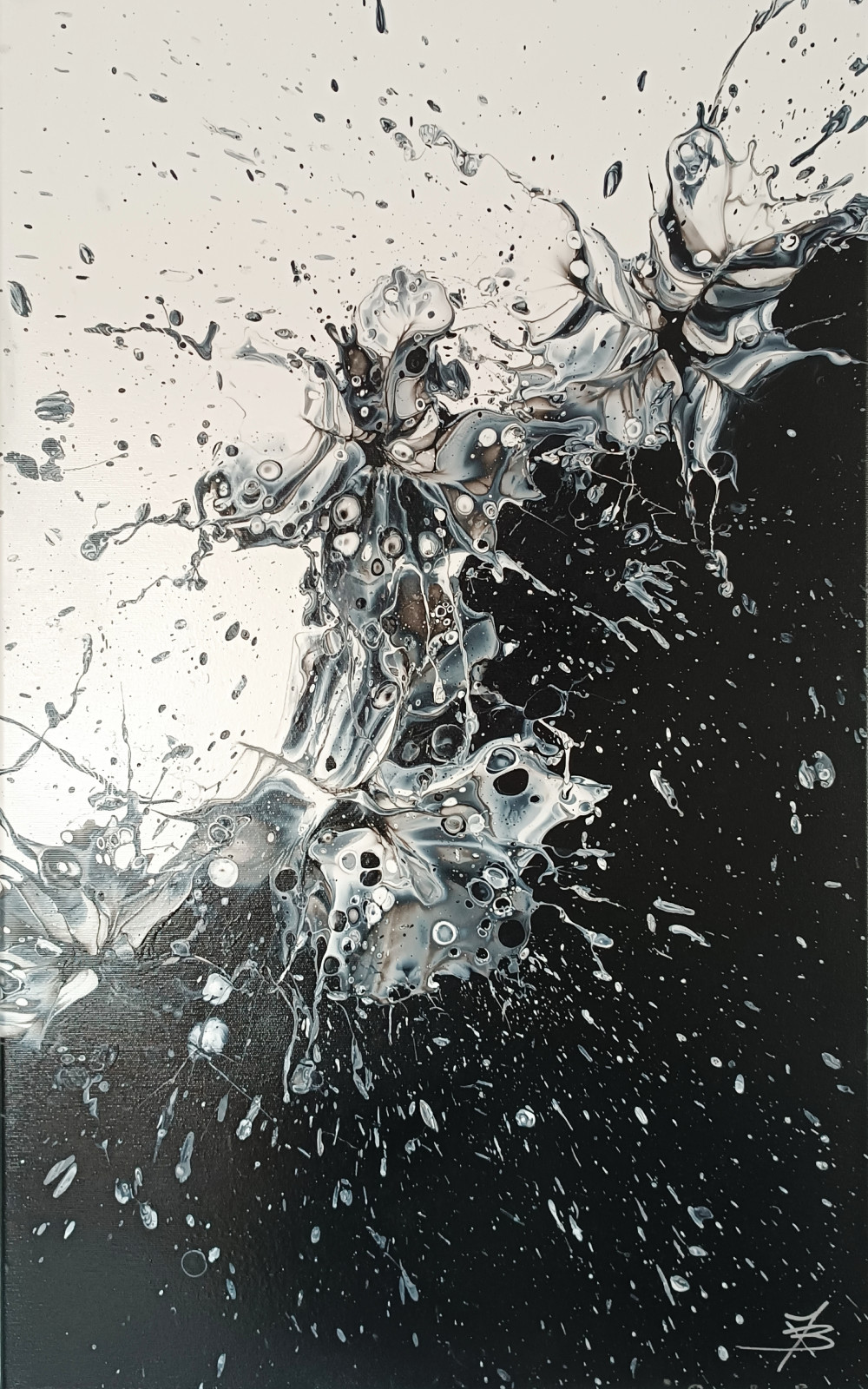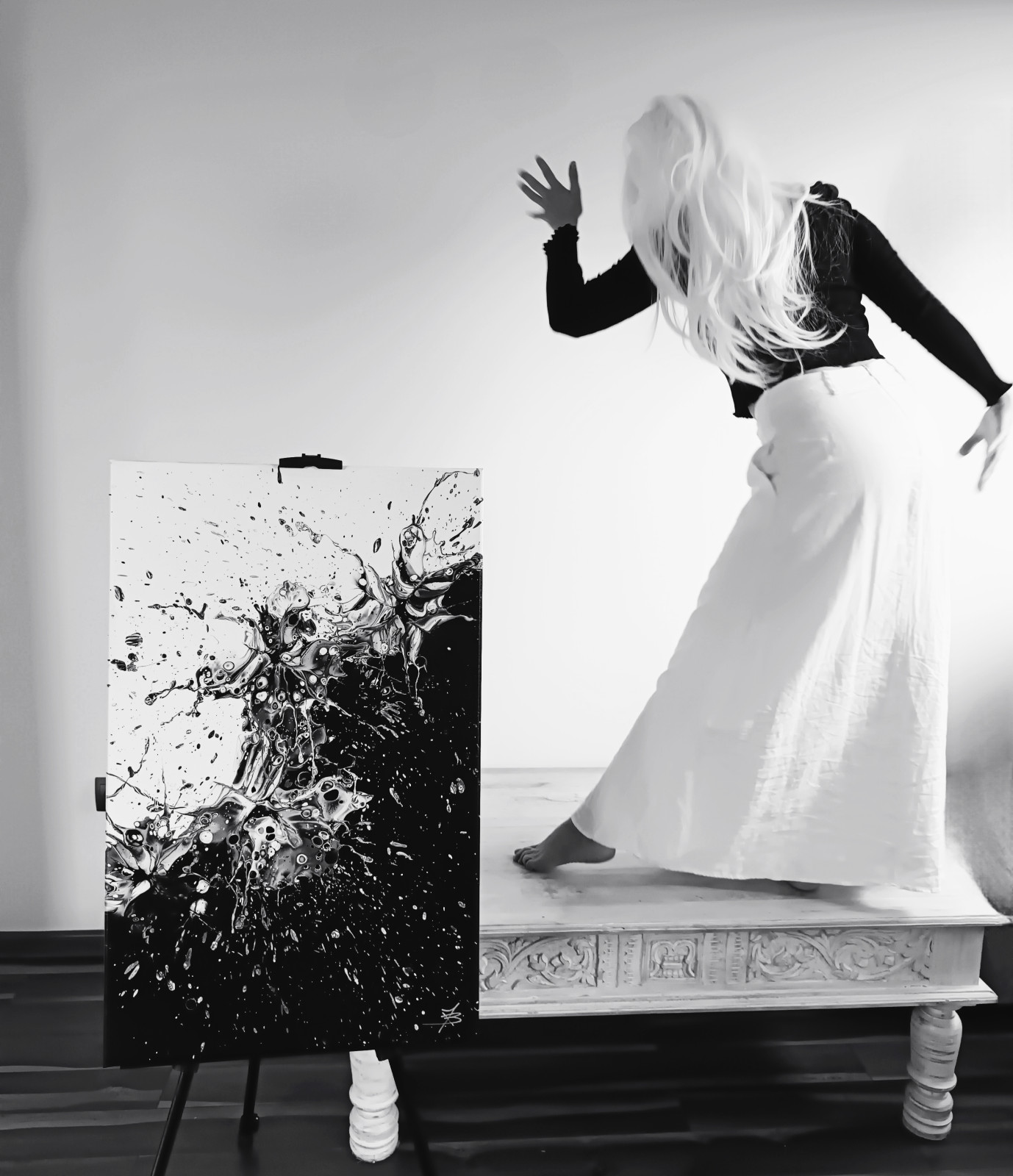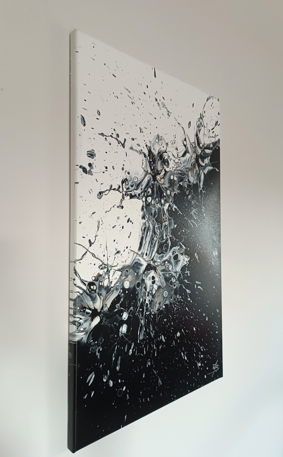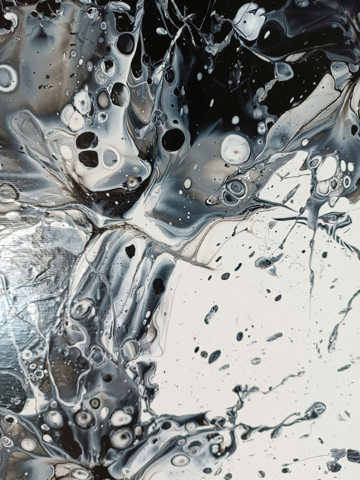 Akryl na płótnie techniką pouringu, motyw czarno-białych kwiatów. Kwiaty są rozchlapane i nieoczywiste, ale gdzieś tam można już je rozpoznać. To symbol tej fazy przejściowej, fazy chaosu, z którego wyłania się coś nowego.