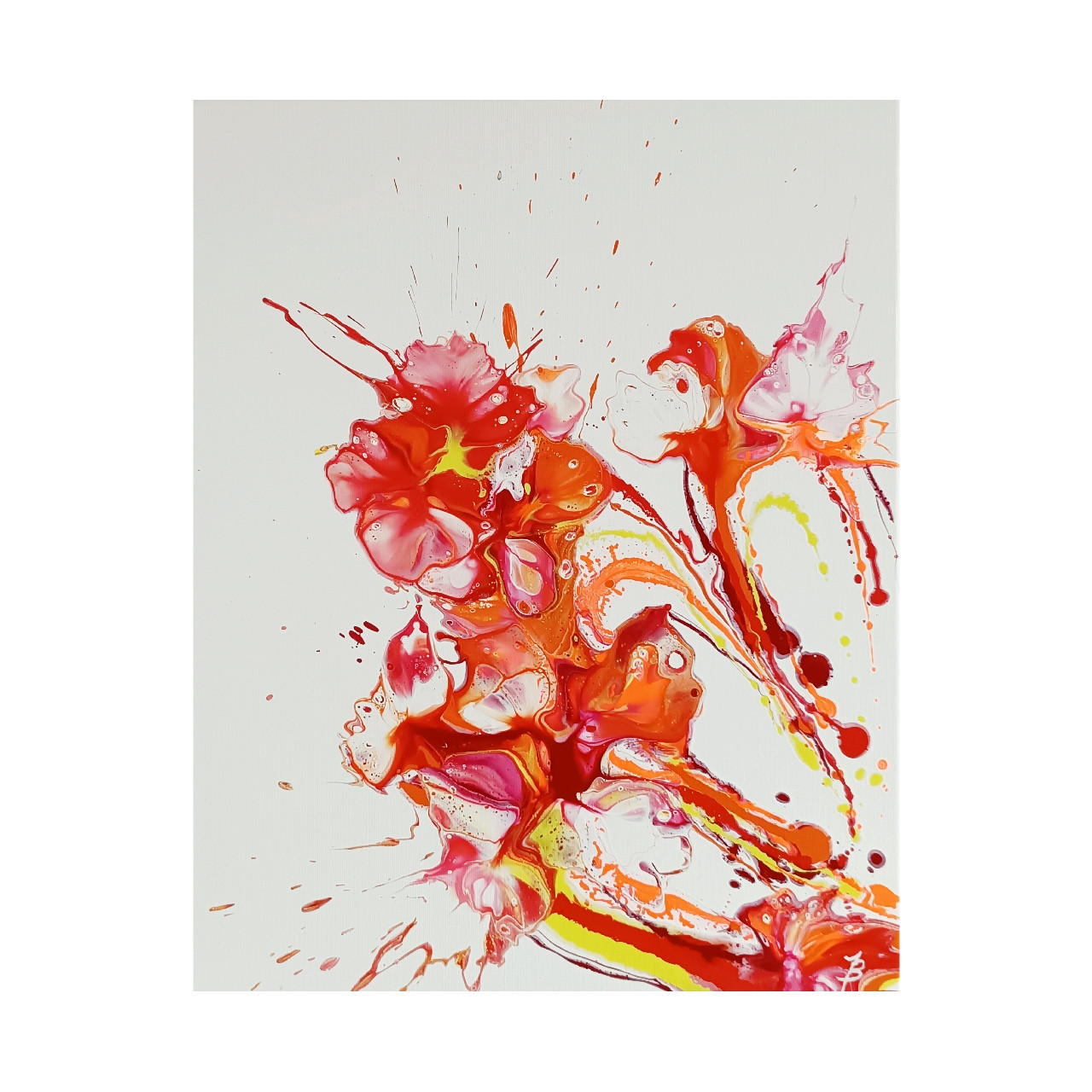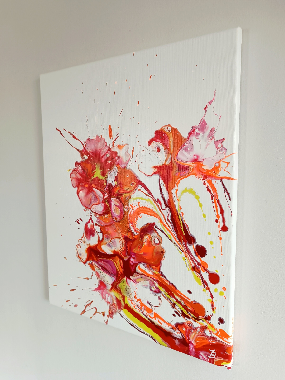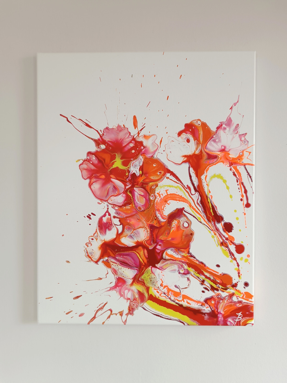 Delikatne kwiaty w żywych kolorach na białym tle wykonane techniką pouringu. Użyto m.in. barwy pomarańczowej fluorescencyjnej, która pięknie roświetli ciemniejsze wnętrza.