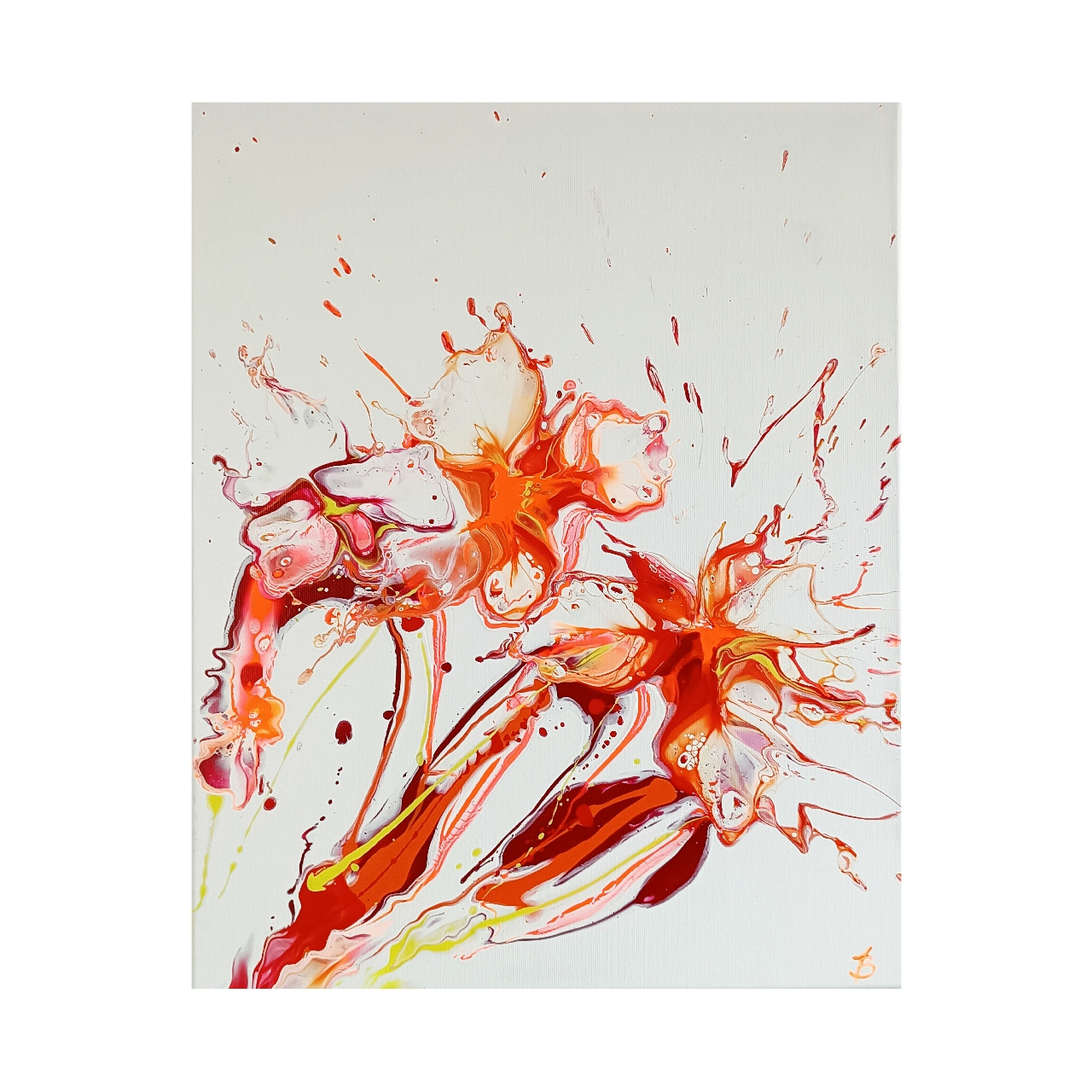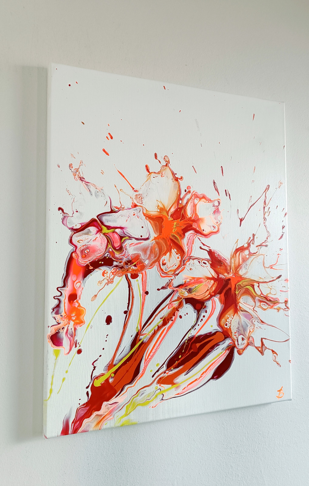 Delikatne kwiaty w żywych kolorach na białym tle wykonane techniką pouringu. Użyto m.in. barwy pomarańczowej fluorescencyjnej, która pięknie roświetli ciemniejsze wnętrza.