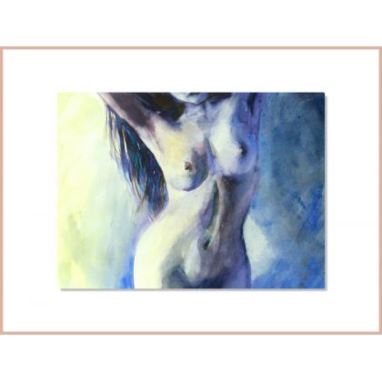 Akwarela należąca do cyklu Au feminin w któym autorka w sposób niedosłowny przedstawia różne aspekty kobiecości. Obraz ma wymiary 40 cm x 50 cm jest oprawiony w passe-partout z którym wymiary zewnętrzne wynoszą 50 cm x 70 cm, sygnowany w dolnym rogu i na odwrocie. Na zdjęciu przykładowa prezentacja we wnętrzu.
