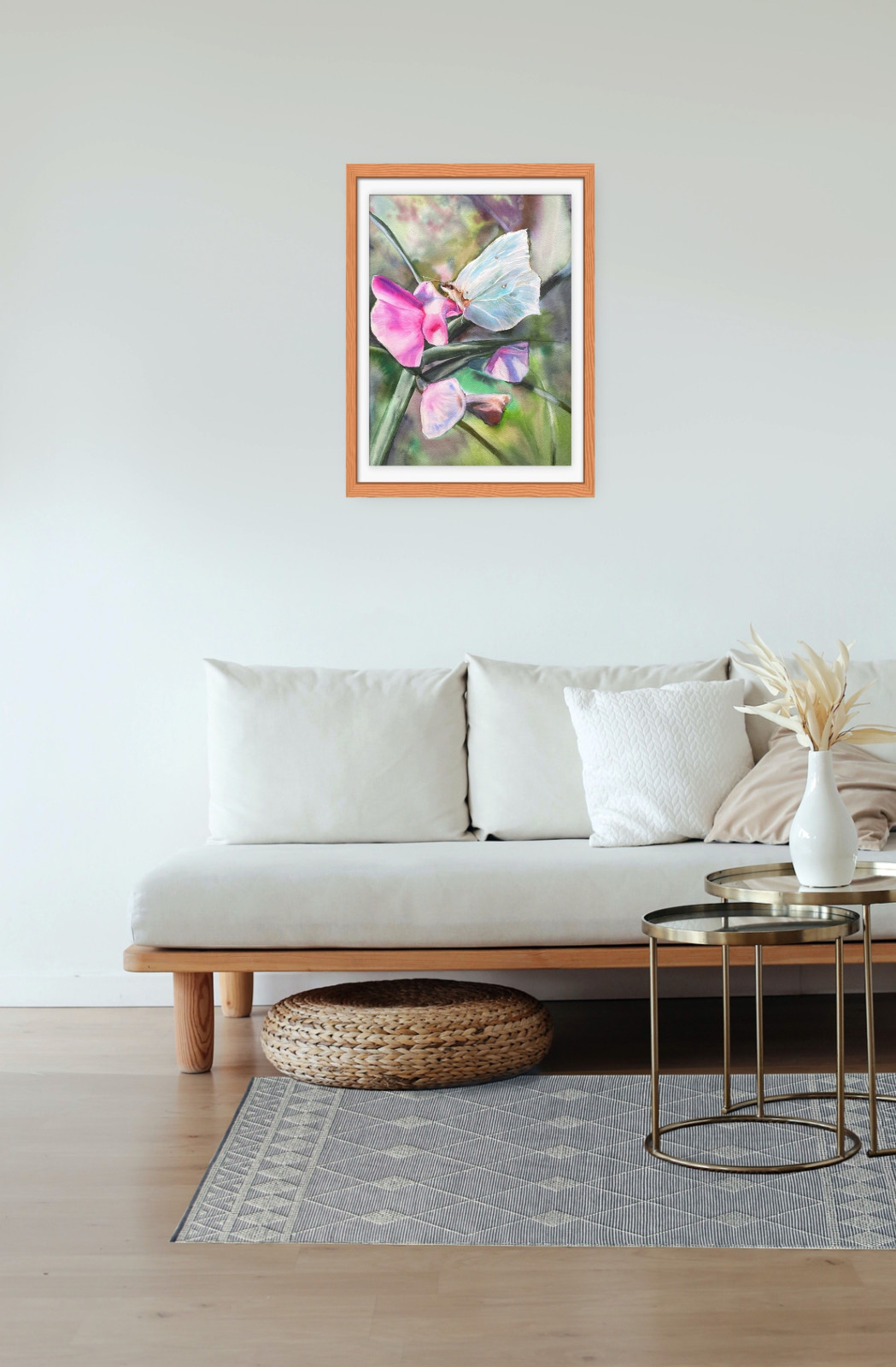 Akwarela ta może stać się uroczym dodatkiem do salonu, sypialni a także udanym prezentem . Wnosi do wnętrza pozytywną atmosferę. Na zdjęciu przykładowa prezentacja.