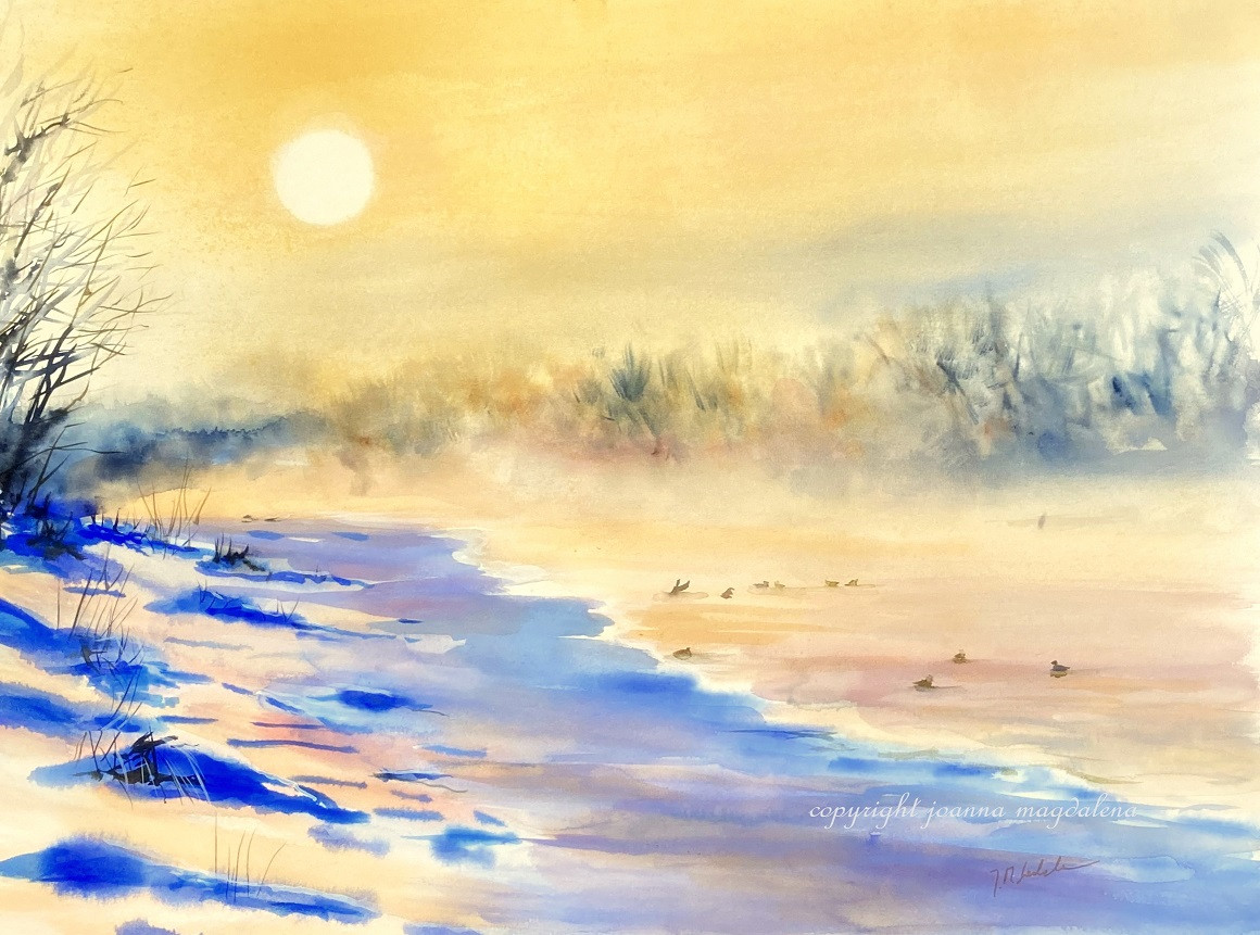 Pejzaż zimowy namalowany na wysokiej jakości papierze akwarelowym o trwałości archiwalnej.