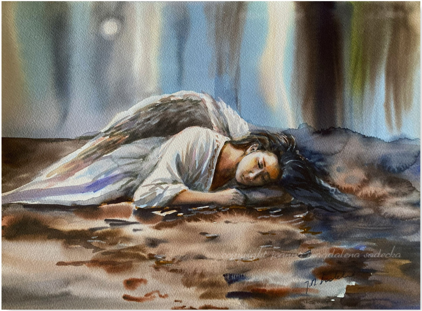 Akwarela należąca do cyklu Między ziemią a niebem namalowana na wysokiej jakości papierze akwarelowym o trwałości archiwalnej. Oprawiona w passe-partout do wymiaru zewnętrznego 50 cm x 40 cm.