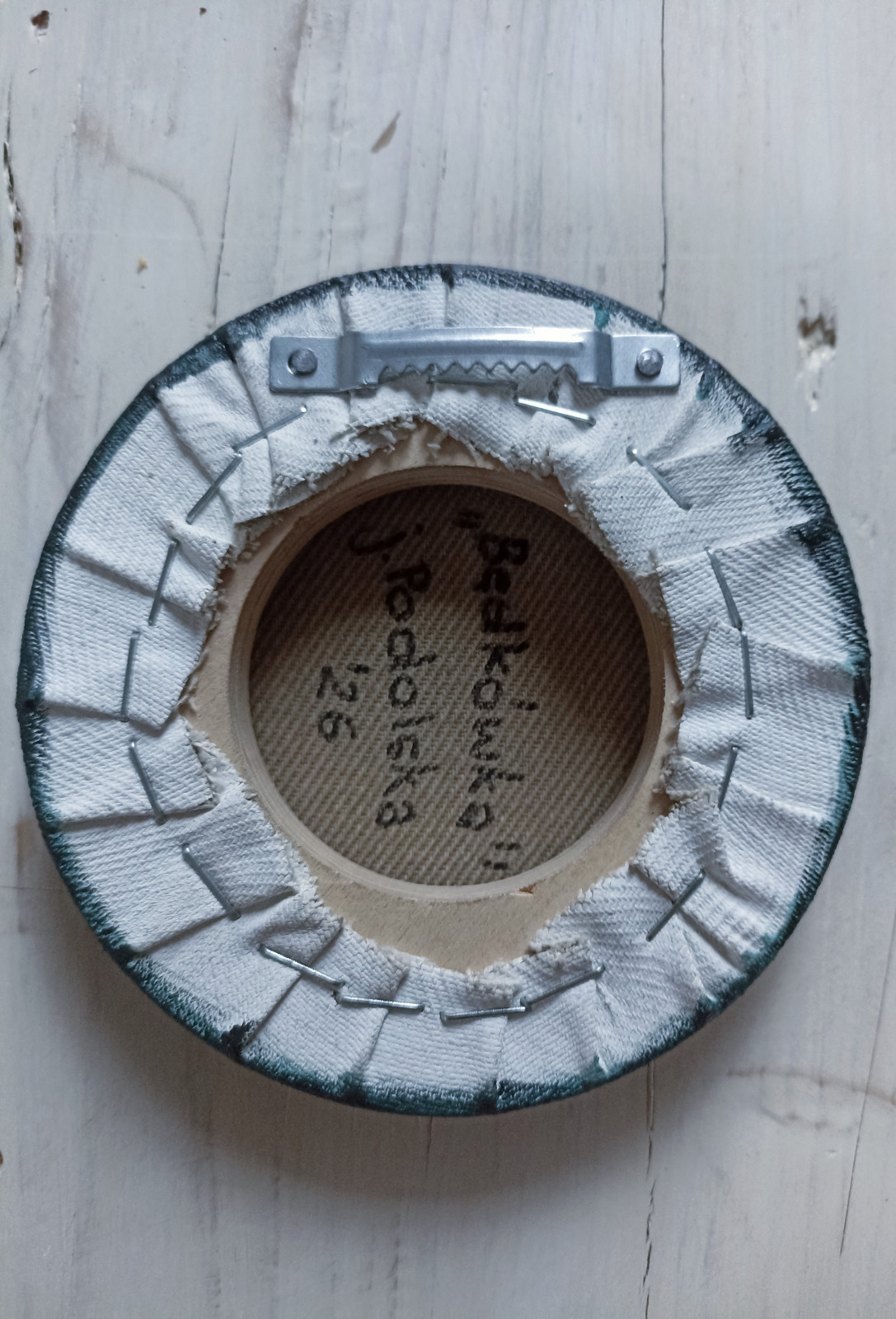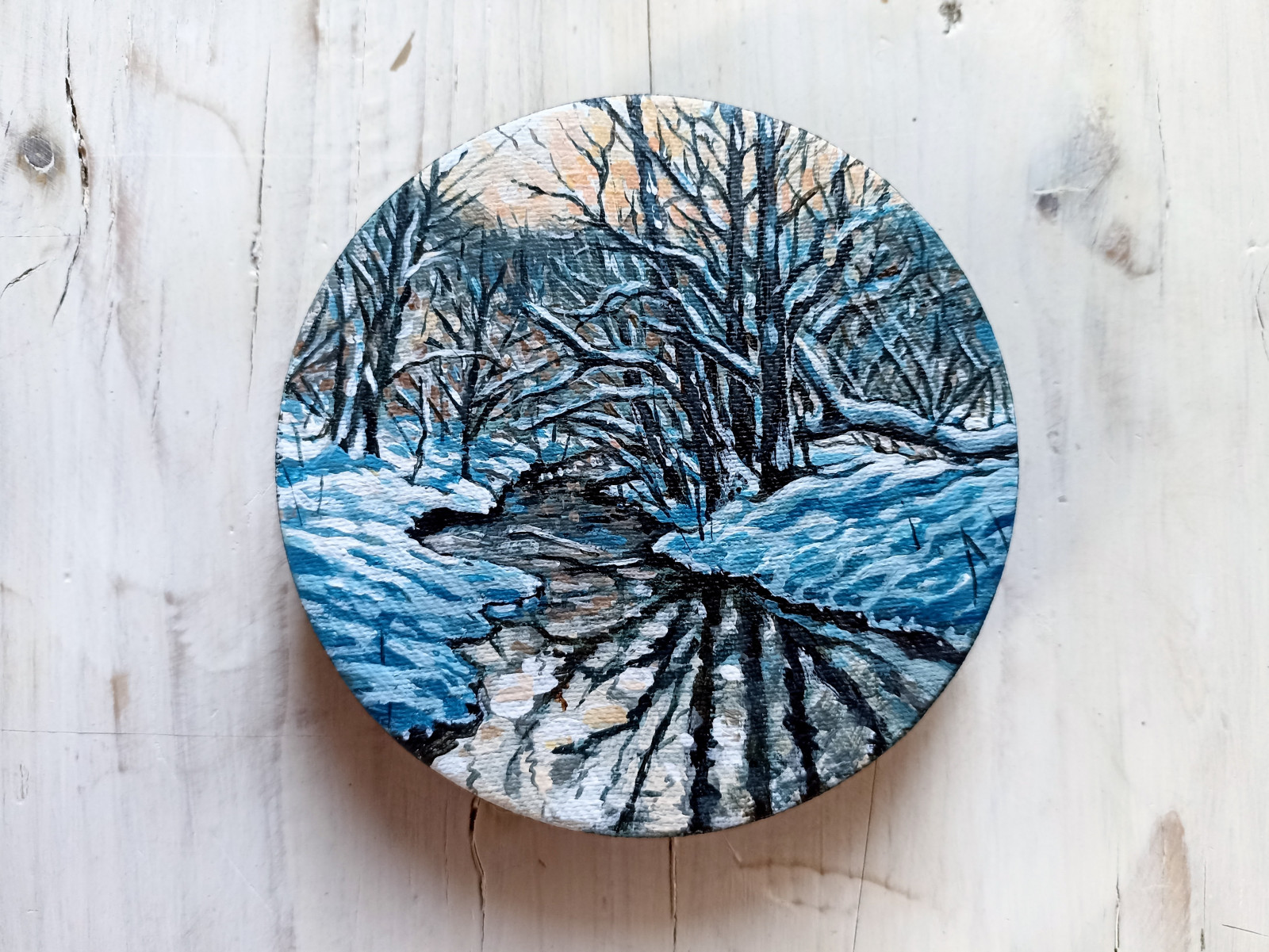 Namalowany na okrągłym podobraziu o średnicy 12 cm pejzaż zimowy przedstawiąjący rzekę Będkówkę (Dolina Będkowska, okolice Krakowa).
