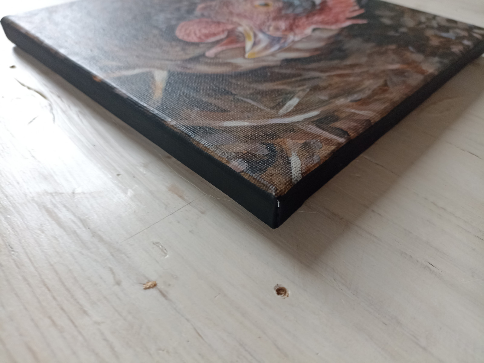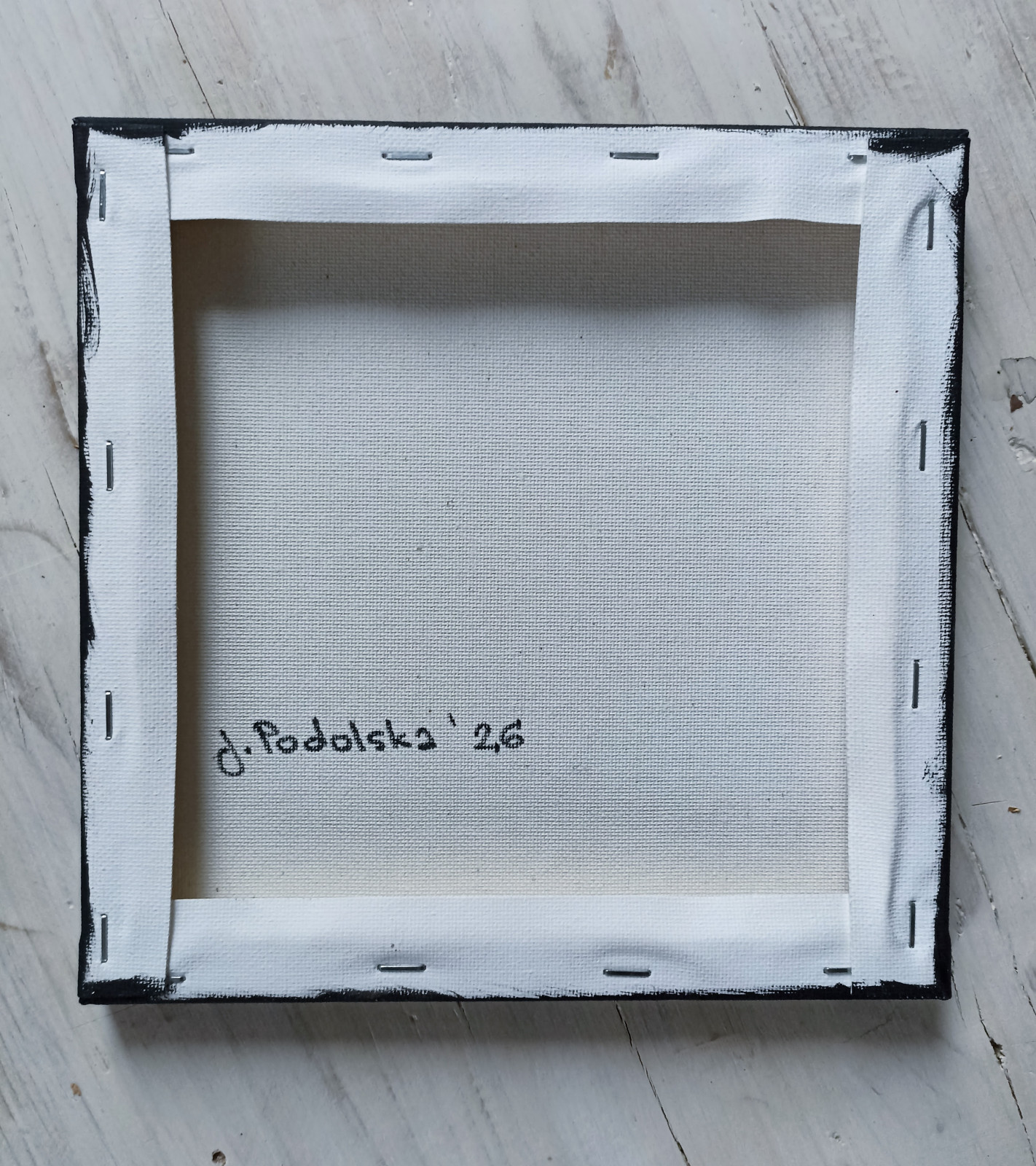 Podobrazie 20 x 20cm, akryl, werniksowany, boki zamalowane na czarno, rok namalowania 2026, podpis na odwrocie.
