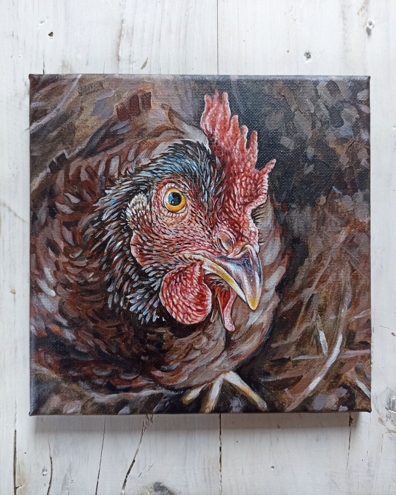 Oferuję realistyczny obraz mojego autorstwa, przedstawiający brązową kurę spoglądającą na nas podejrzliwym wzrokiem :) .