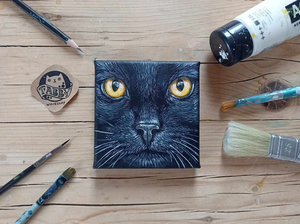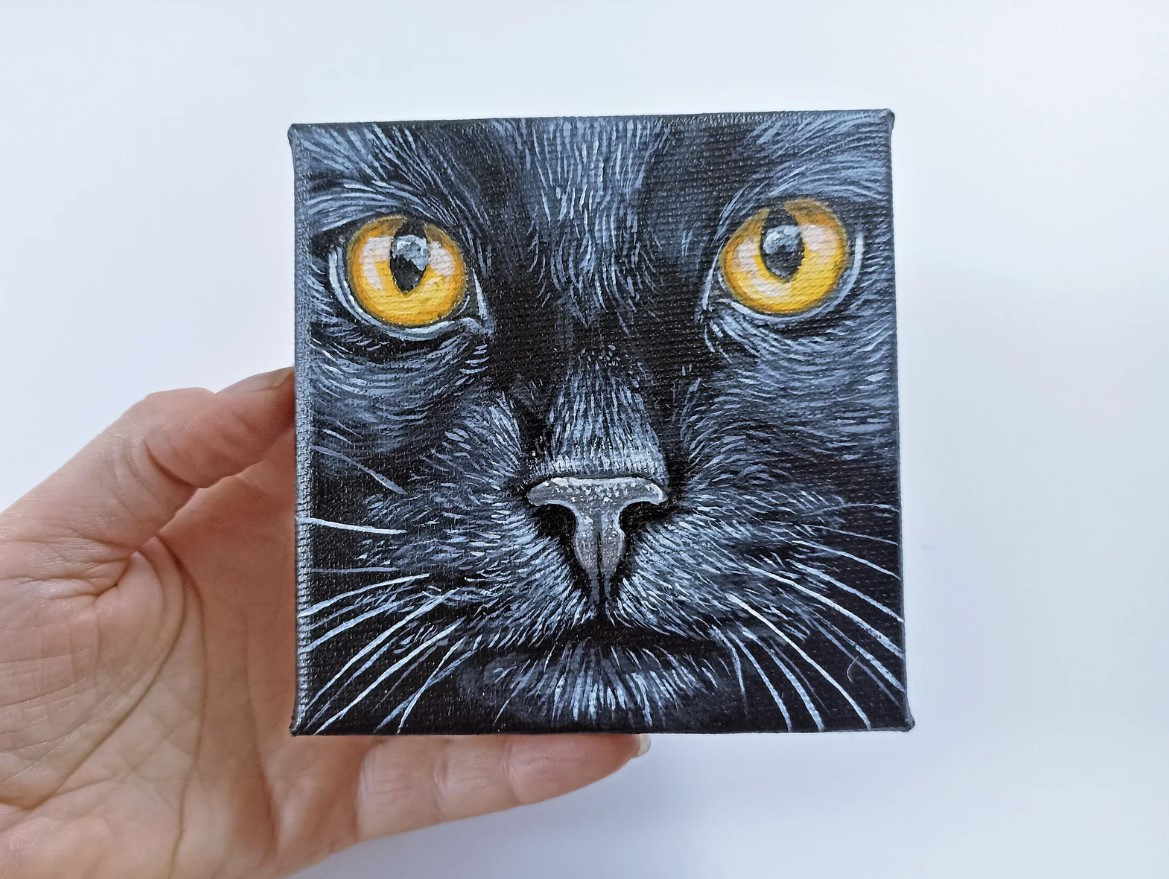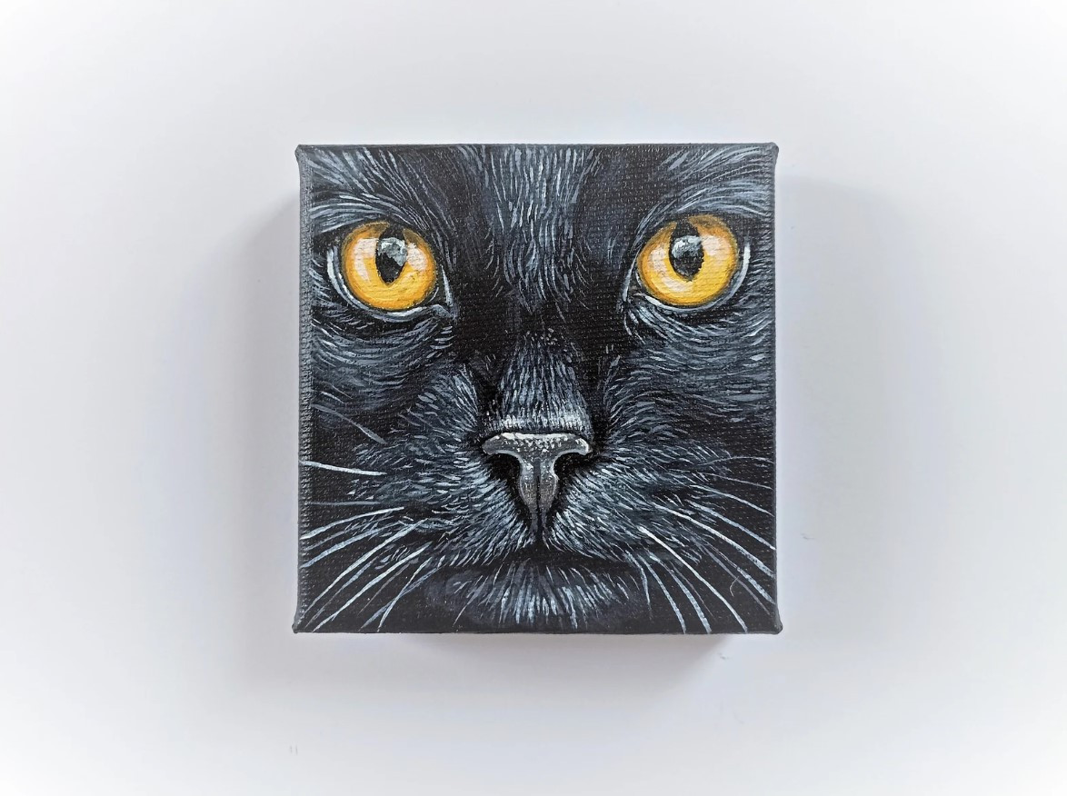 Obrazek z portretem czarnego kota namalowałam farbami akrylowymi na podobraziu bawełnianym o wymiarach 10x10cm