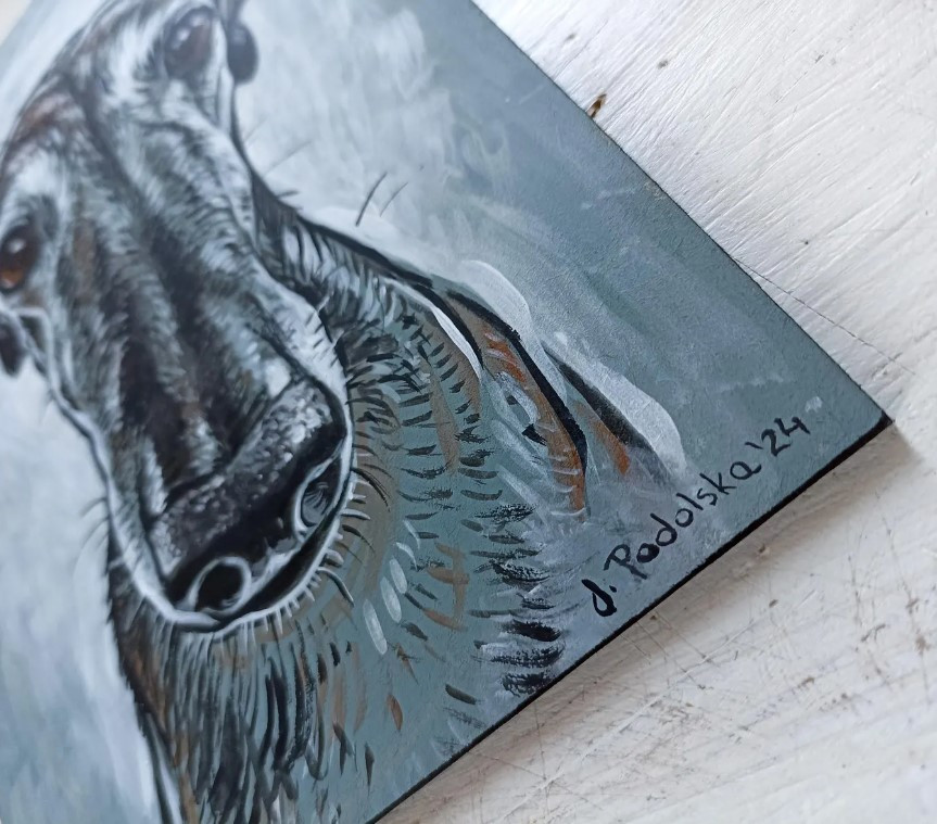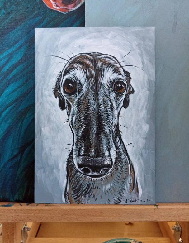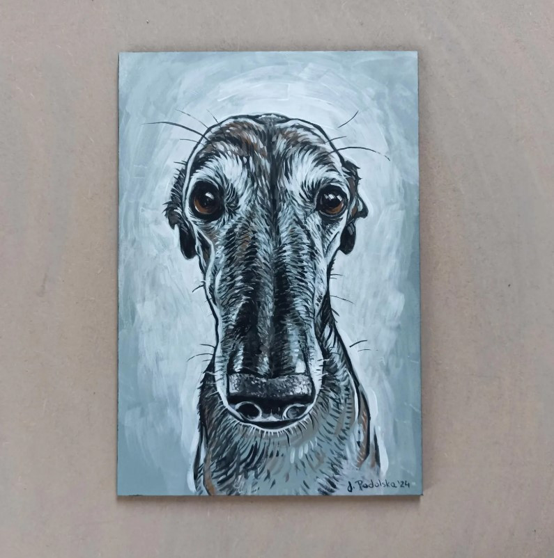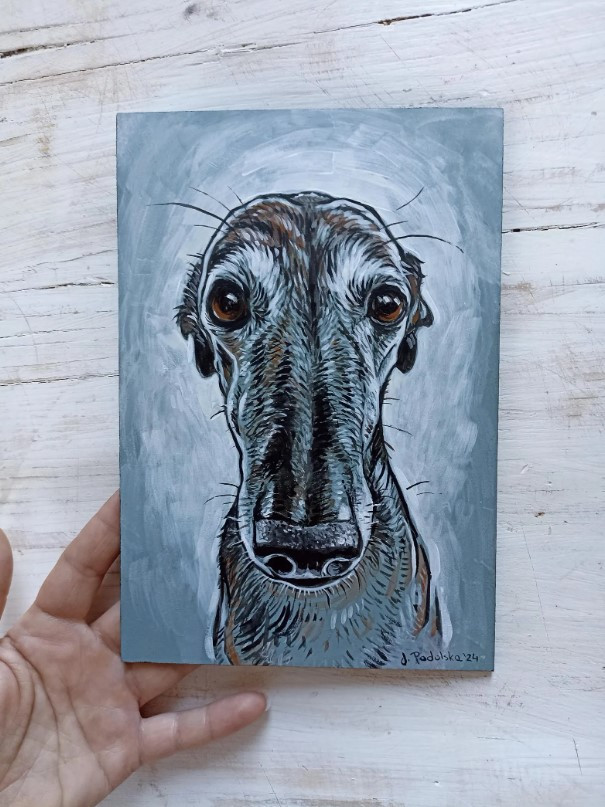 Oferuję portret charta namalowany farbami akrylowymi na płycie hdf o wymiarach 14,5 cm x 21 cm.