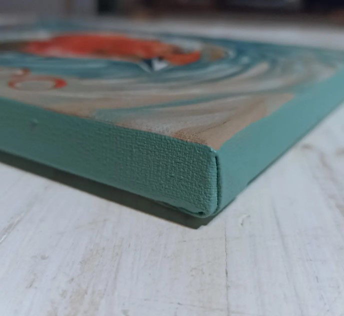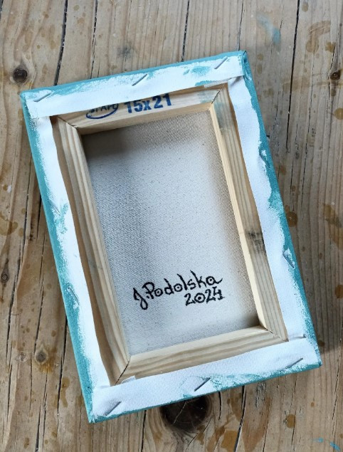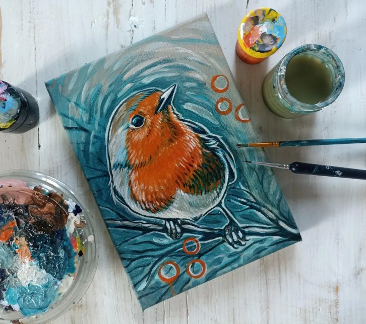 Ręcznie malowany obraz akrylowy przedstawiający ptaka rudzika. Obraz namalowany jest na podobraziu o wymiarach 21x15cm, werniksowany, boki zamalowane, podpisany na odwrocie, rok namalowania 2024.